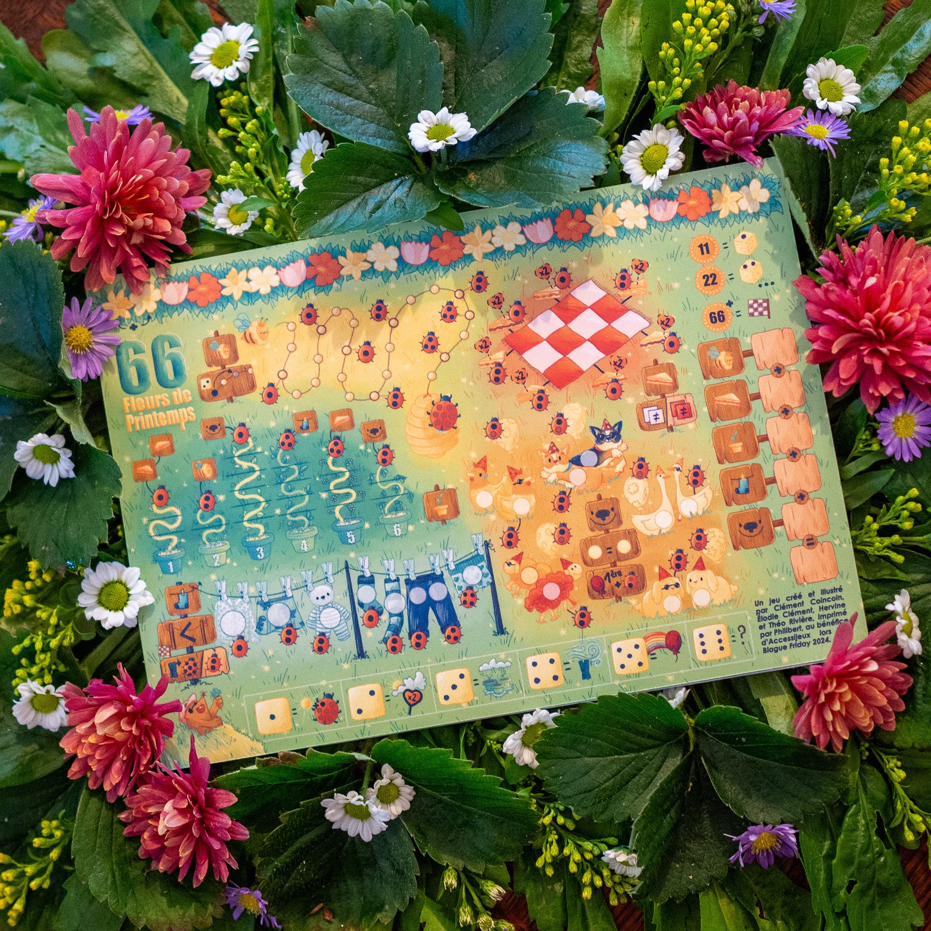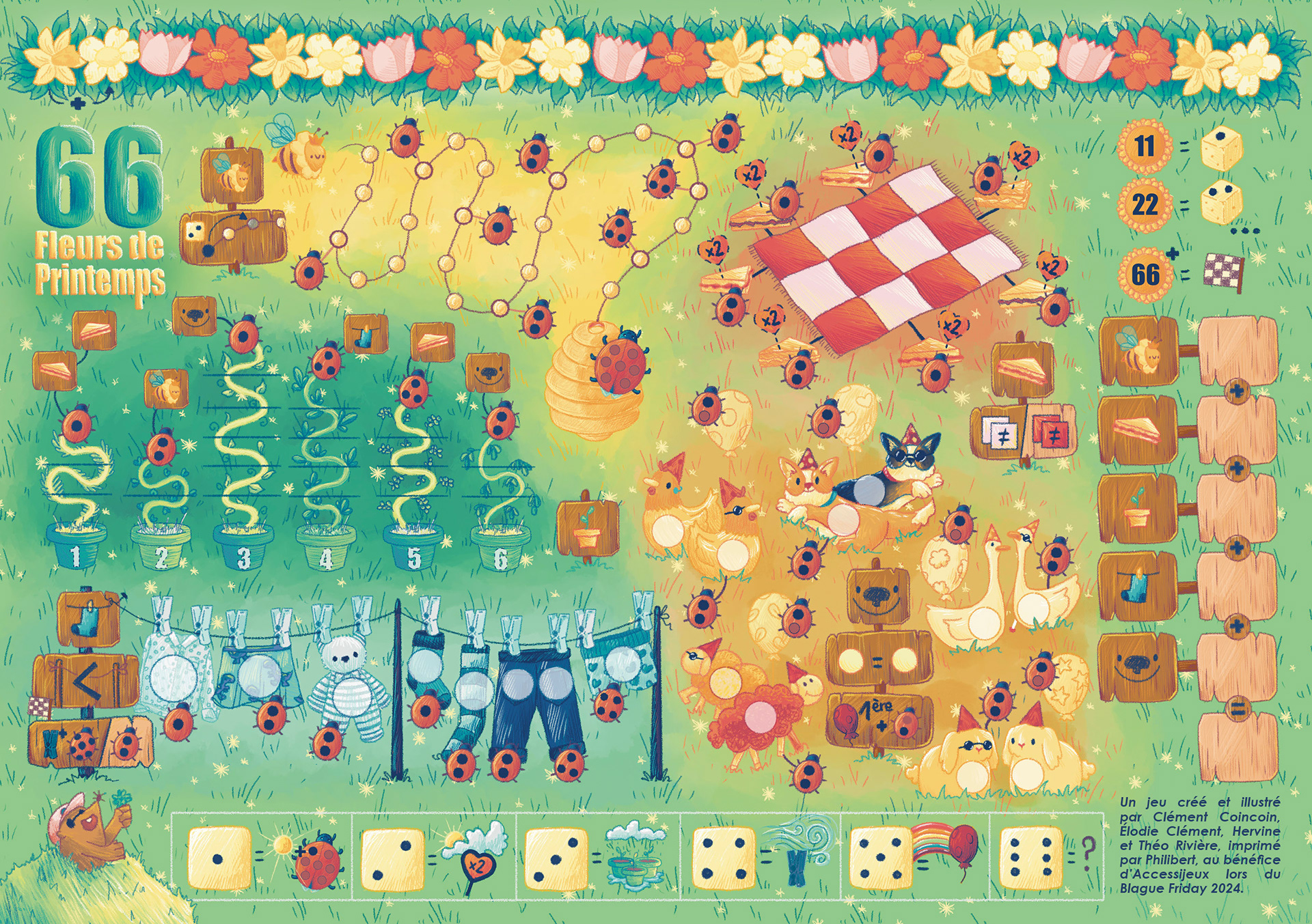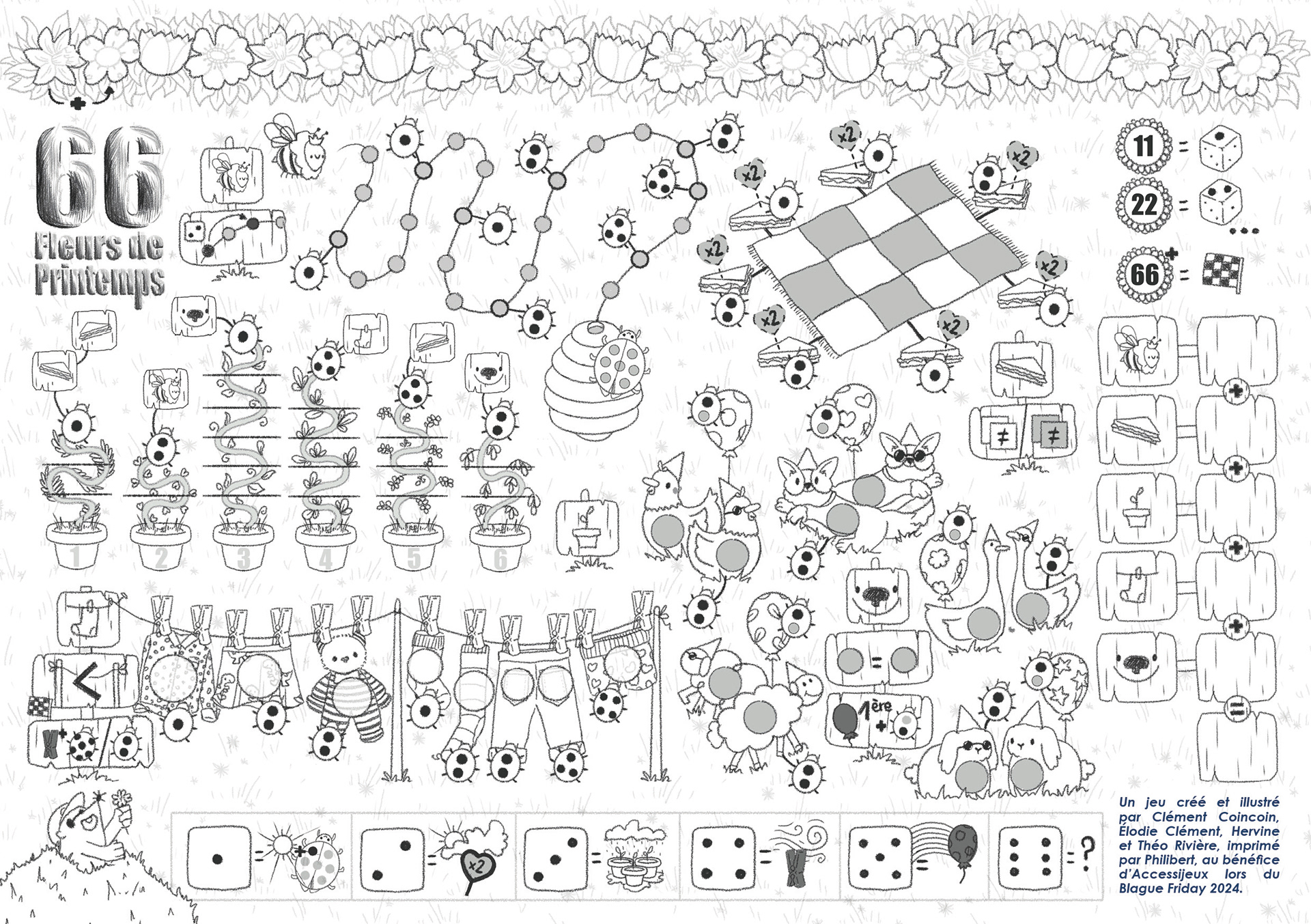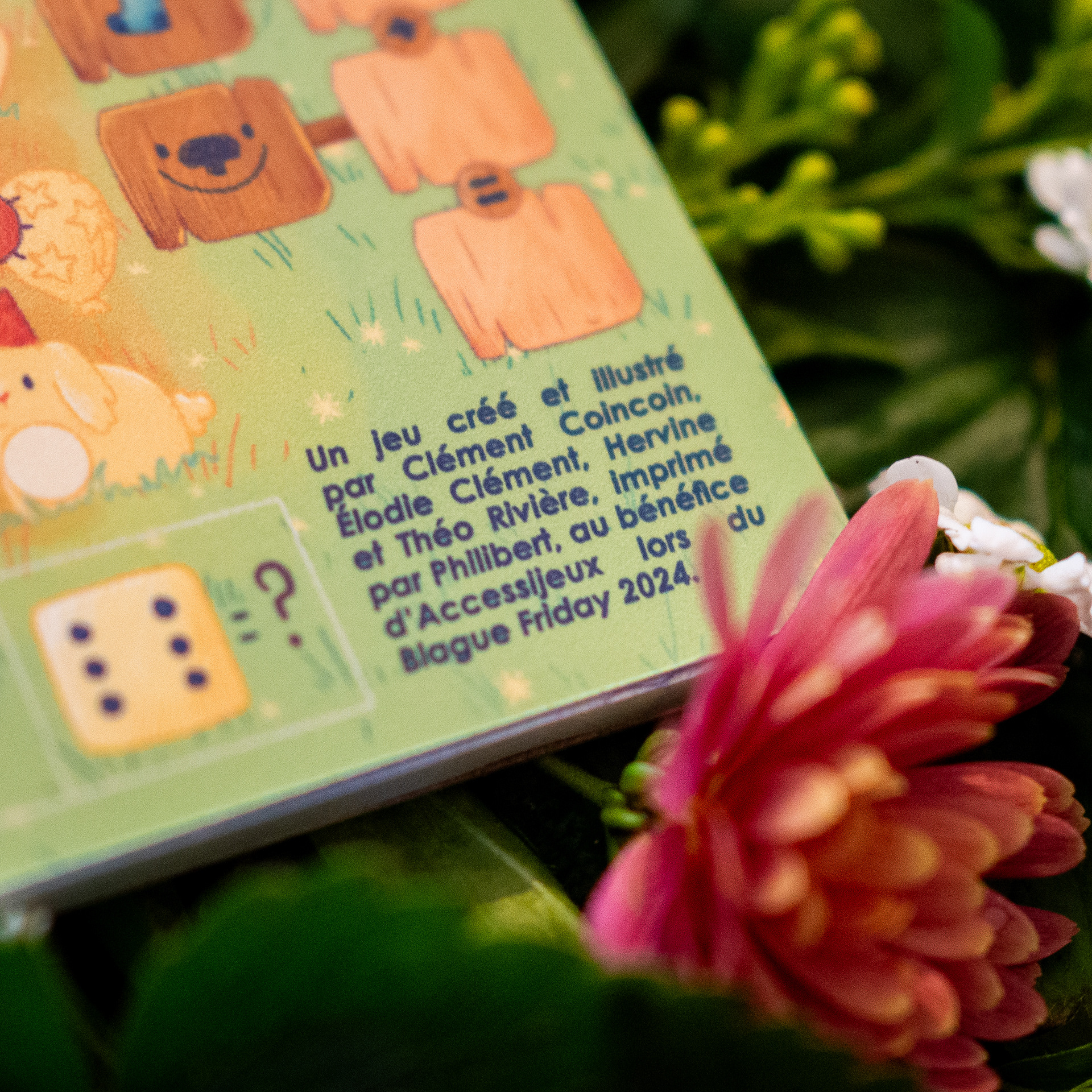 Dans le cadre de leur traditionnel Blague Friday, Philibert souhaite, en 2024, proposer un jeu dont l'intégralité des recettes est reversée à Accessijeux, une association qui sensibilise le public et propose des jeux de société pour les personnes déficientes visuelles. Théo Rivière a créé un jeu pour l'occasion, à imprimer chez soi. J'ai réalisé les illustrations, dans un thème très printanier !