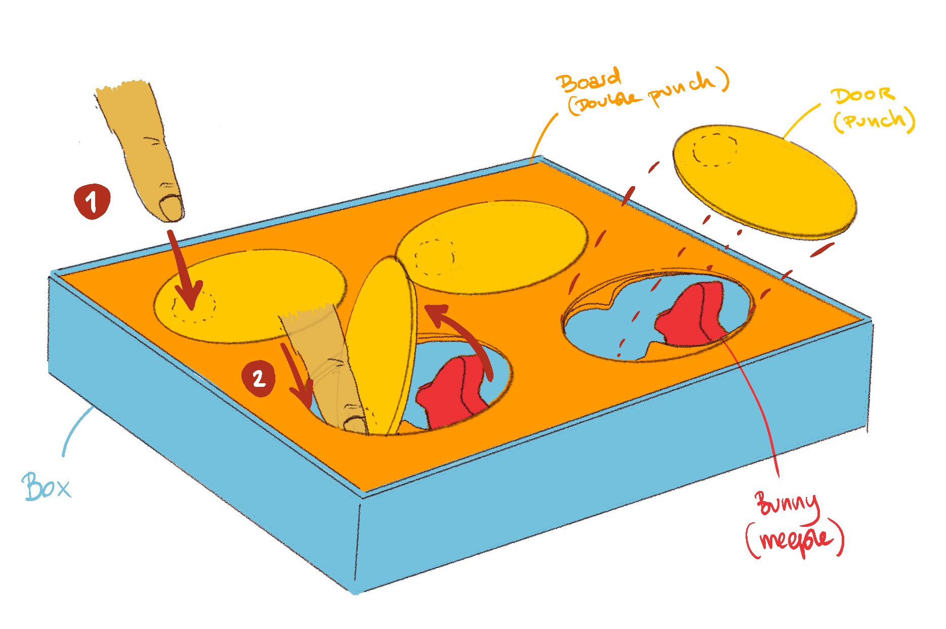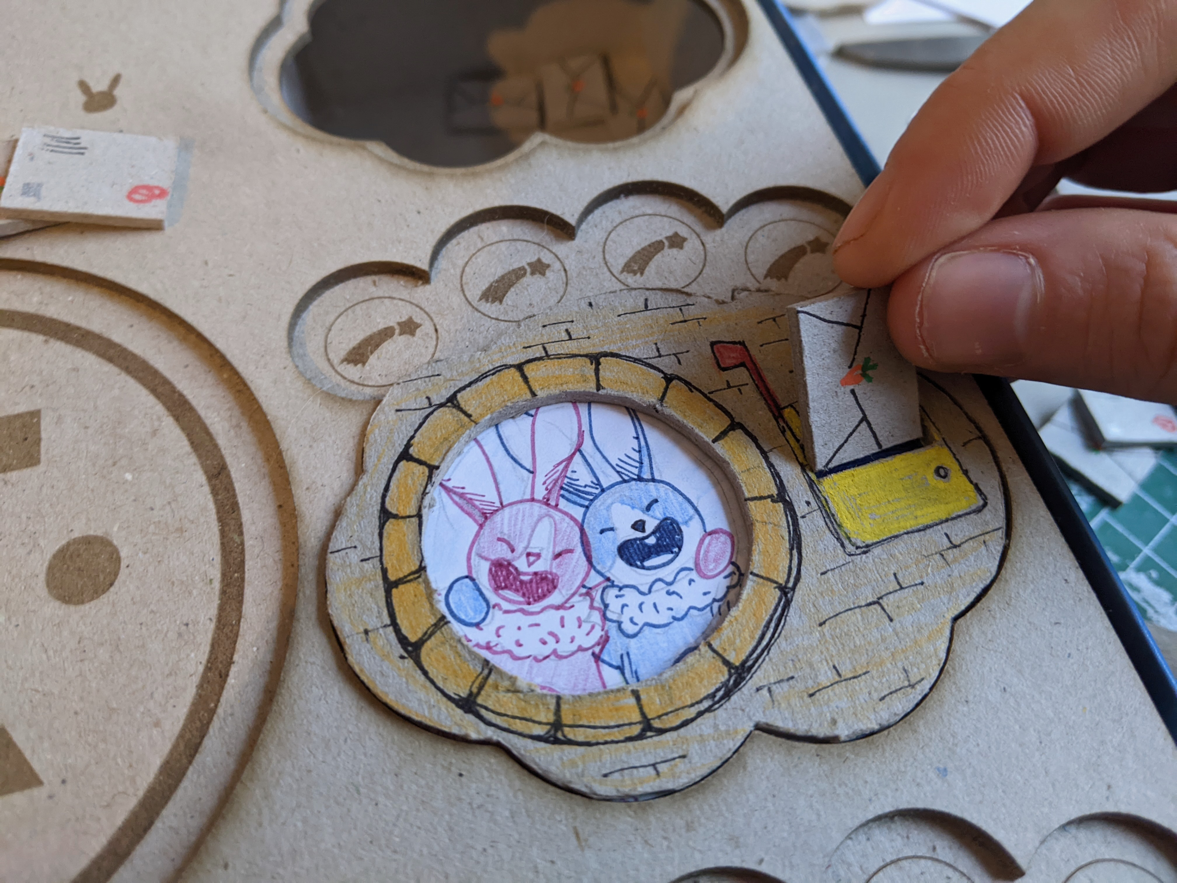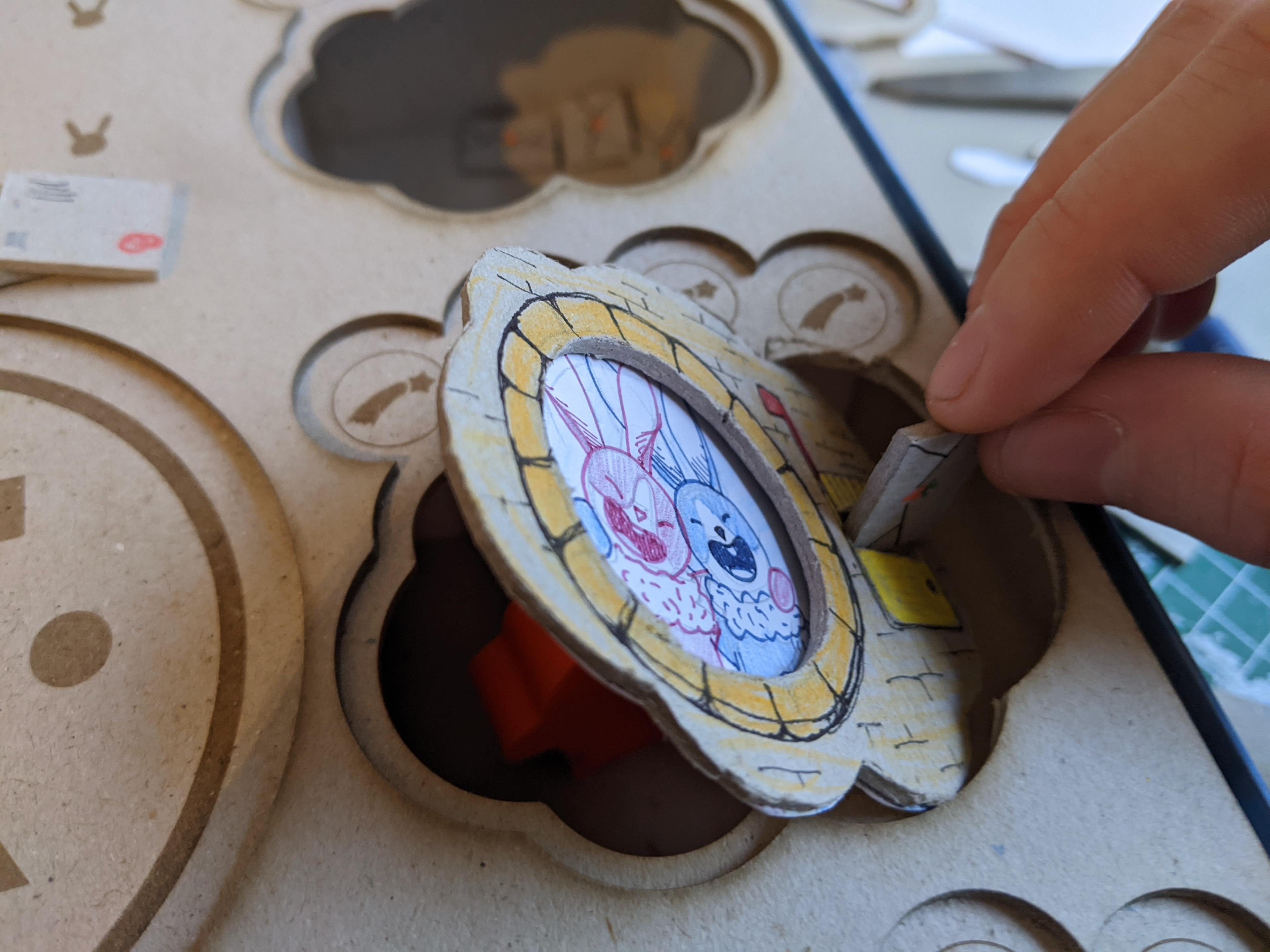 Avec la nouvelle thématique proposée et les mécaniques qui s'affinaient, j'ai entièrement repensé le système d'ouverture de porte. Ouvrir les portes pour inviter les lapins à la fête est l'un des moments préférés des enfants ! C'est très facile à prendre en main, on sait où appuyer sans réfléchir, et ça fait toujours un bel effet.