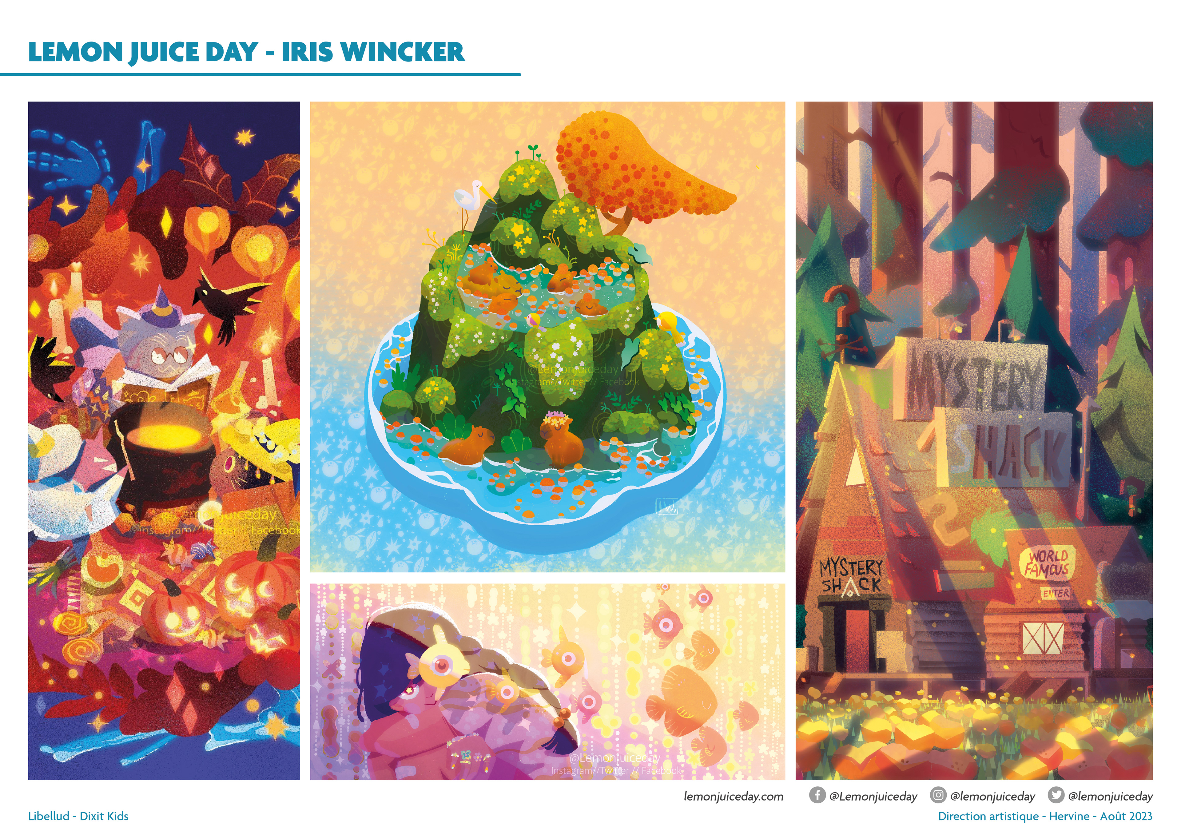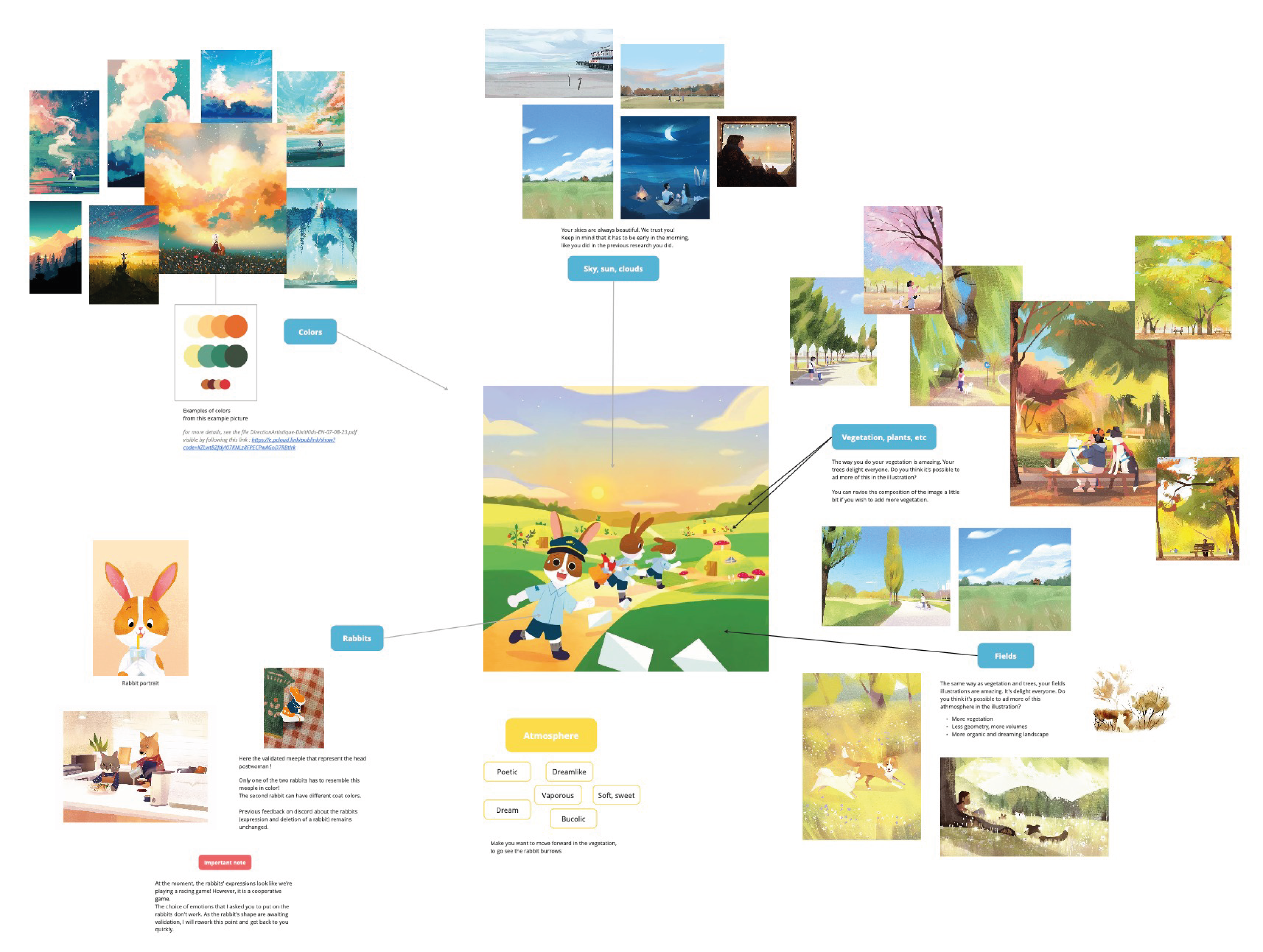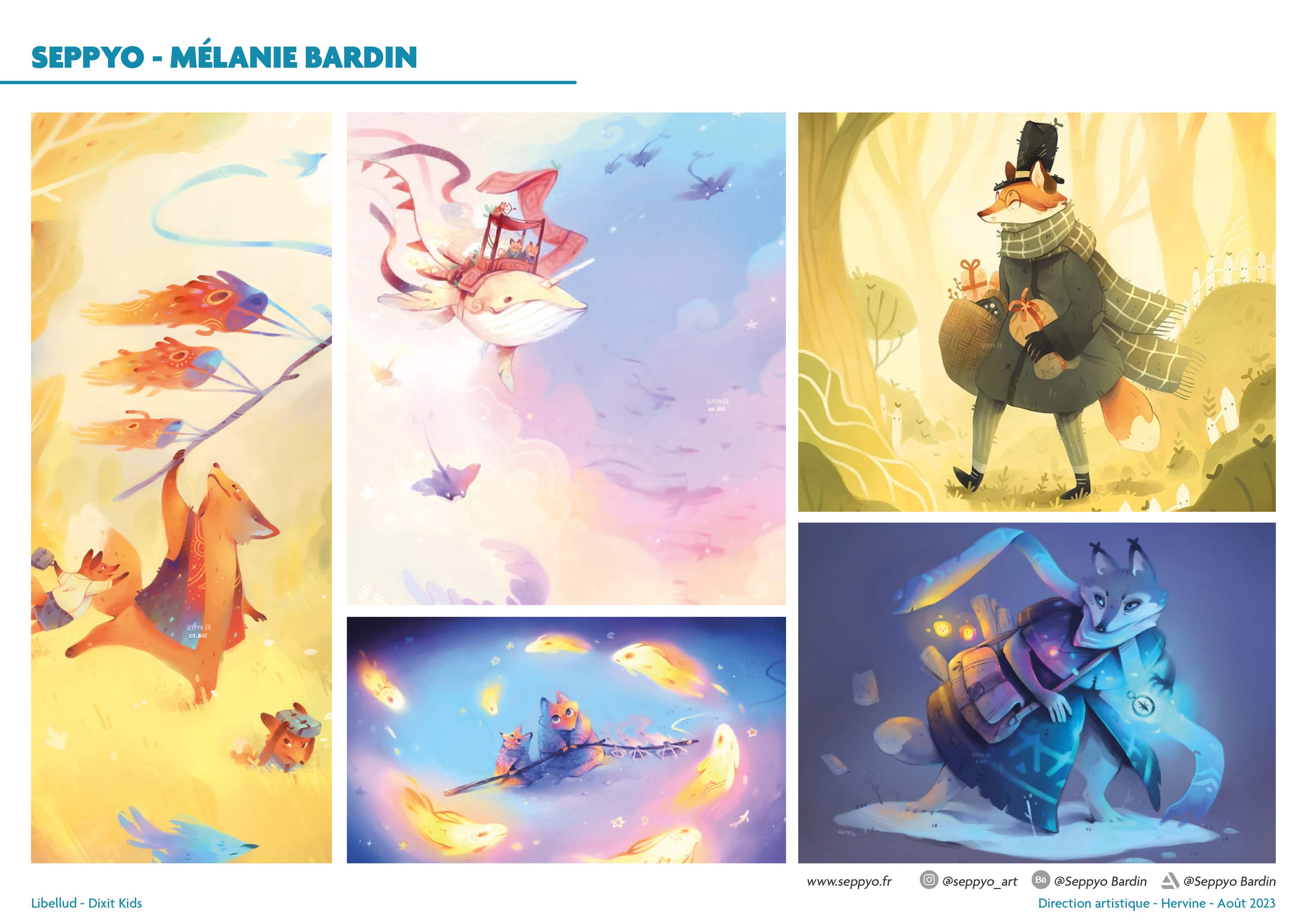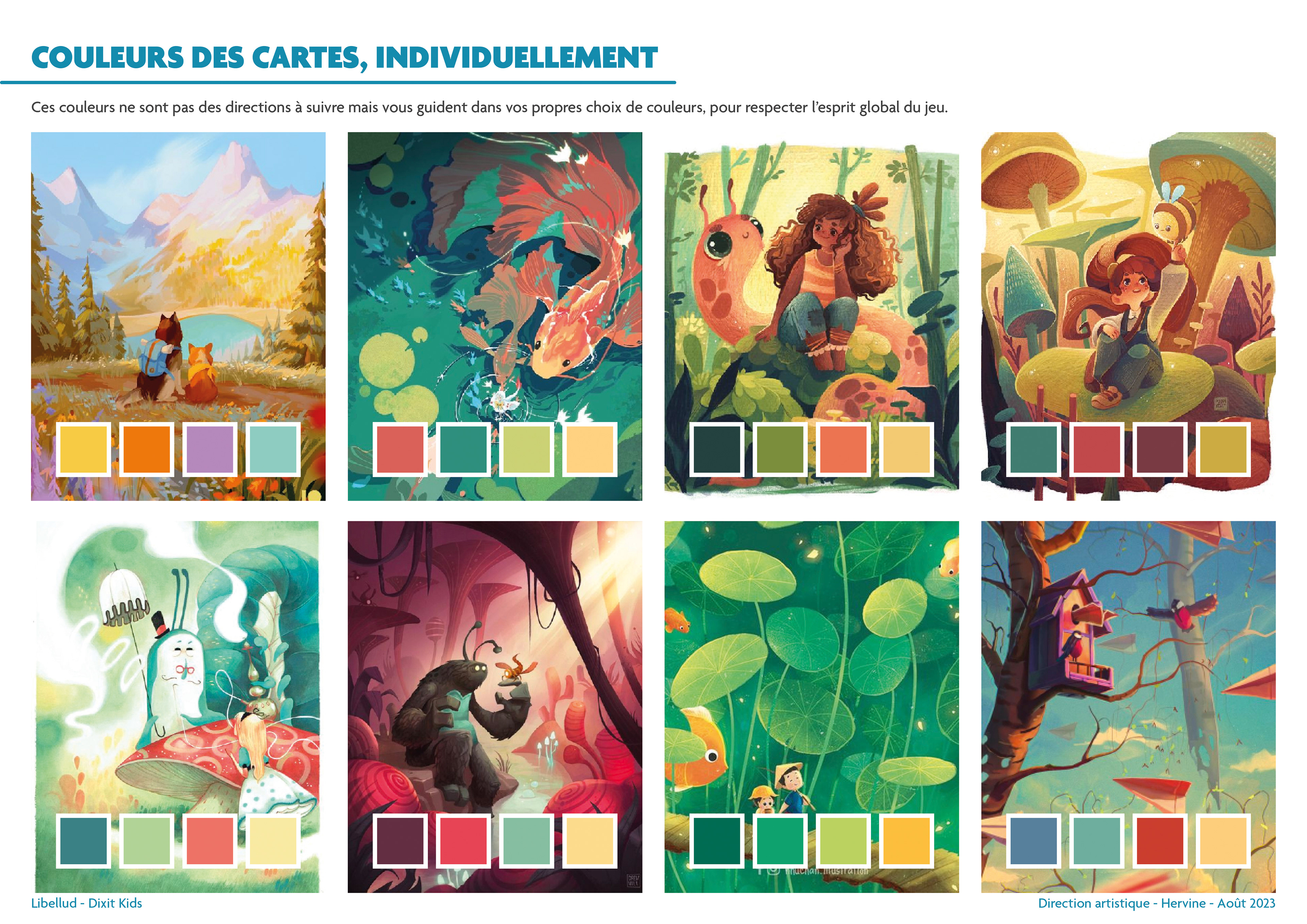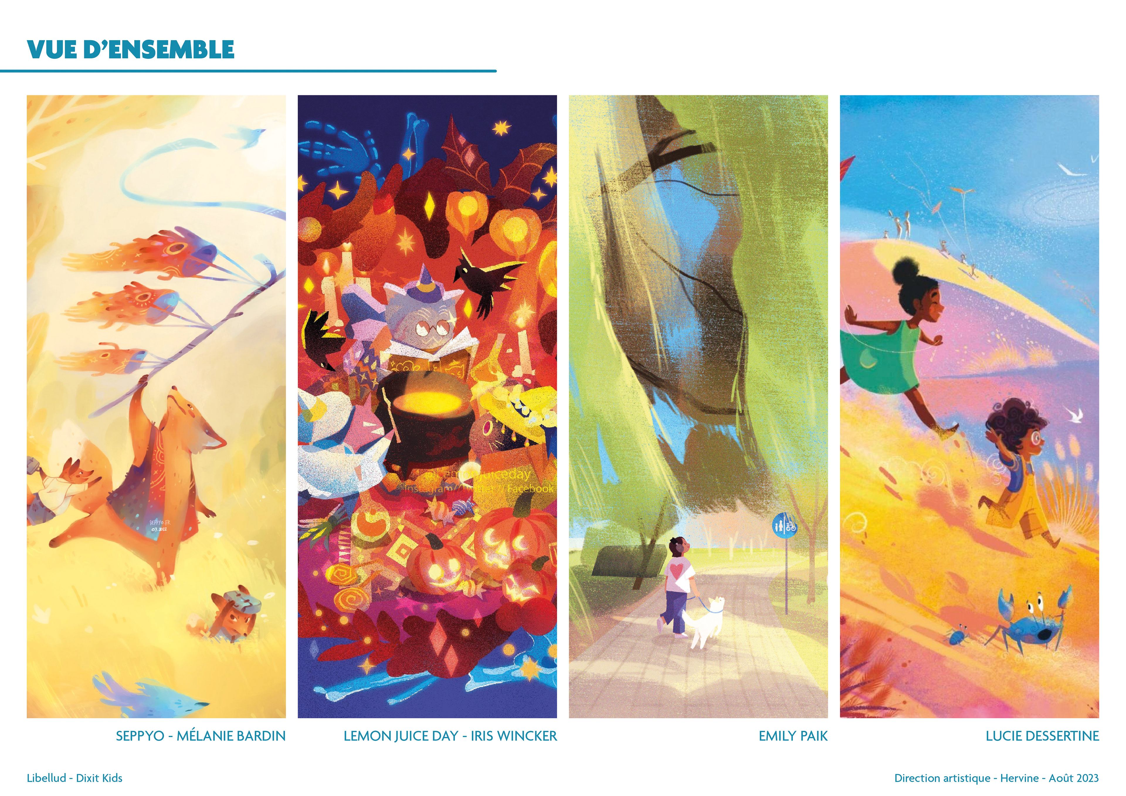 Je ne peux pas révéler tous les aspects du processus, mais voici un aperçu du travail que j'ai réalisé afin que les quatre illustratrices, Seppyo (Mélanie Bardin), Lucie Dessertine, Emily (Seung Eun) Paik et Lemonjuiceday (Iris Winker) puissent travailler dans les meilleures conditions possibles. Les illustrations des moodboards présentés ci-contre comportent des illustrations n'appartenant pas à Dixit ou aux maisons d'édition.