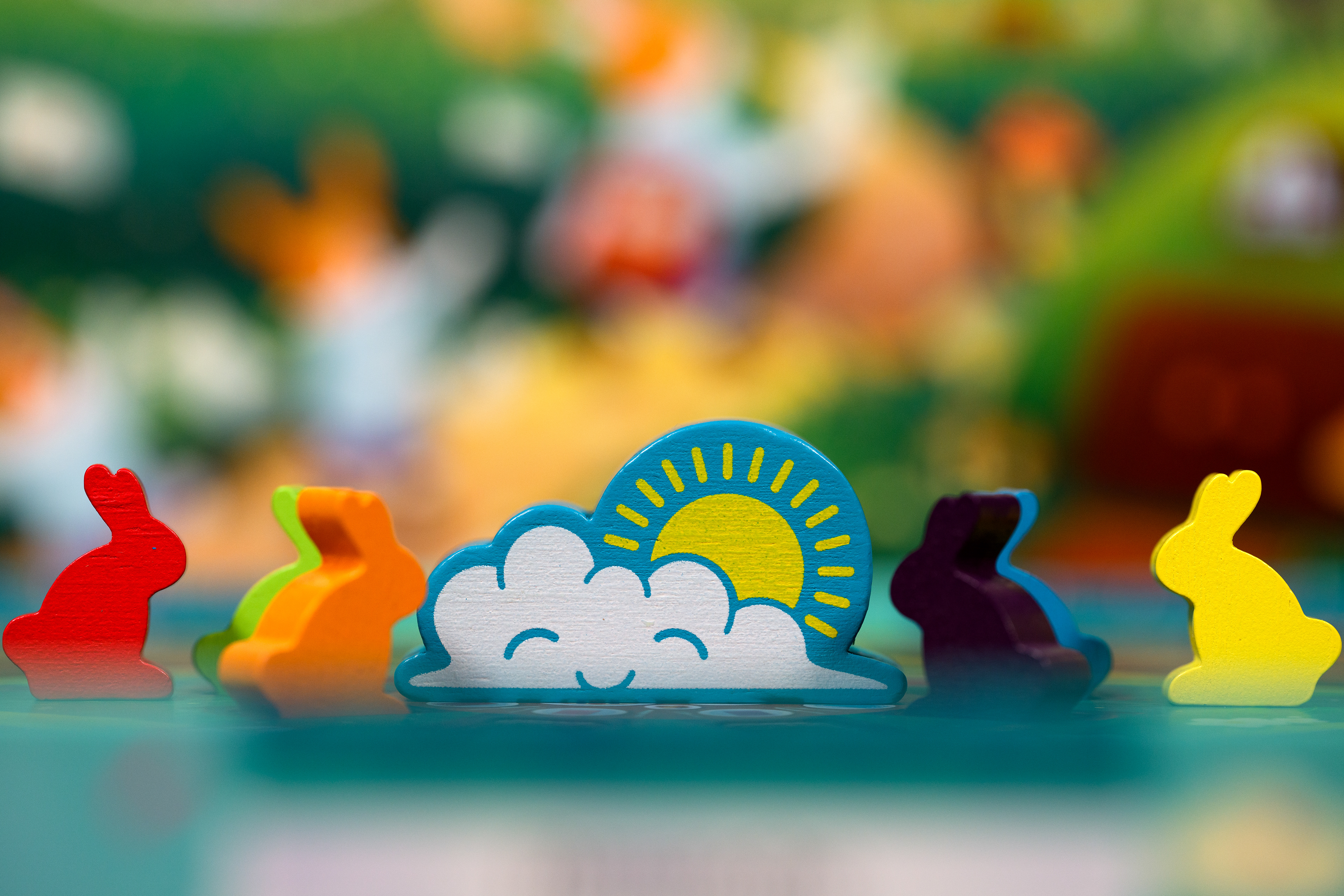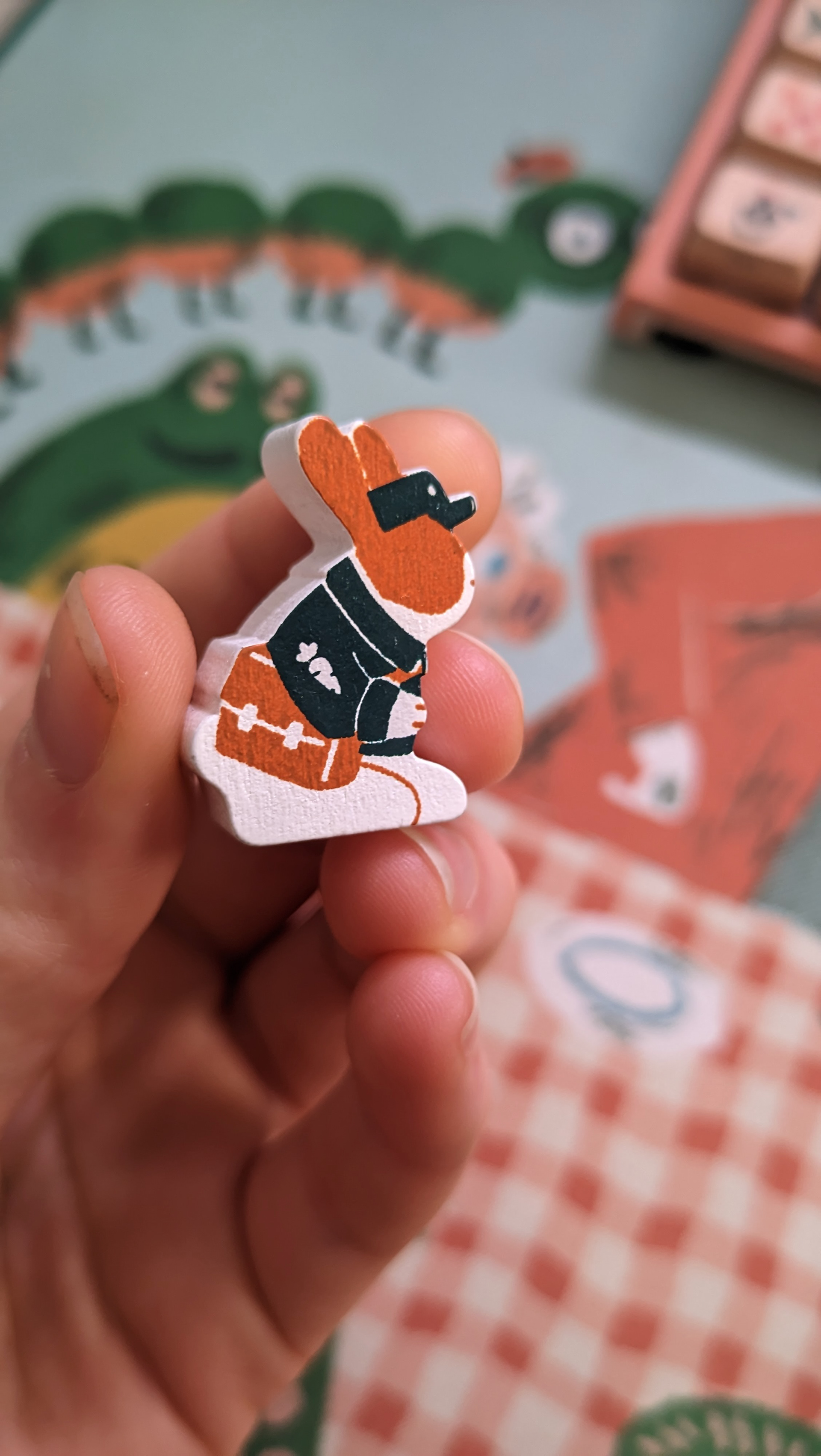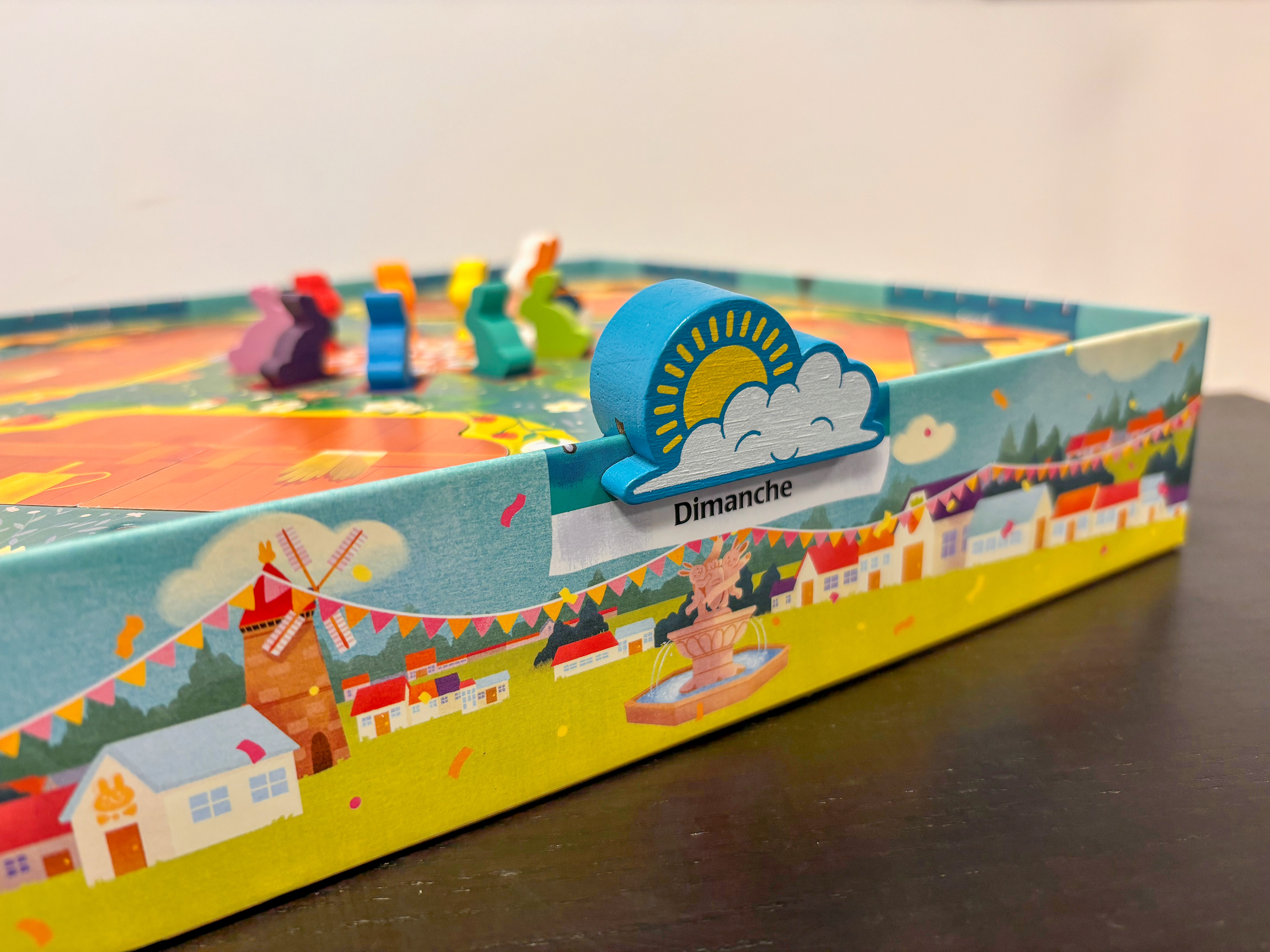 Les lapins ont la même silhouette que le reste de la gamme Dixit. Cependant, j'ai soigneusement choisi leurs couleurs. De nouvelles teintes pour un nouveau jeu, qui s'accordent parfaitement avec l'univers coloré de Dixit Kids, tout en offrant des contrastes suffisamment forts pour qu'un maximum de personnes atteintes de daltonisme puissent différencier les meeples entre eux. Ce n'est pas un aspect essentiel de la mécanique de jeu, mais pour des enfants, le simple fait de pouvoir identifier clairement les lapins peut fluidifier l'expérience de jeu.