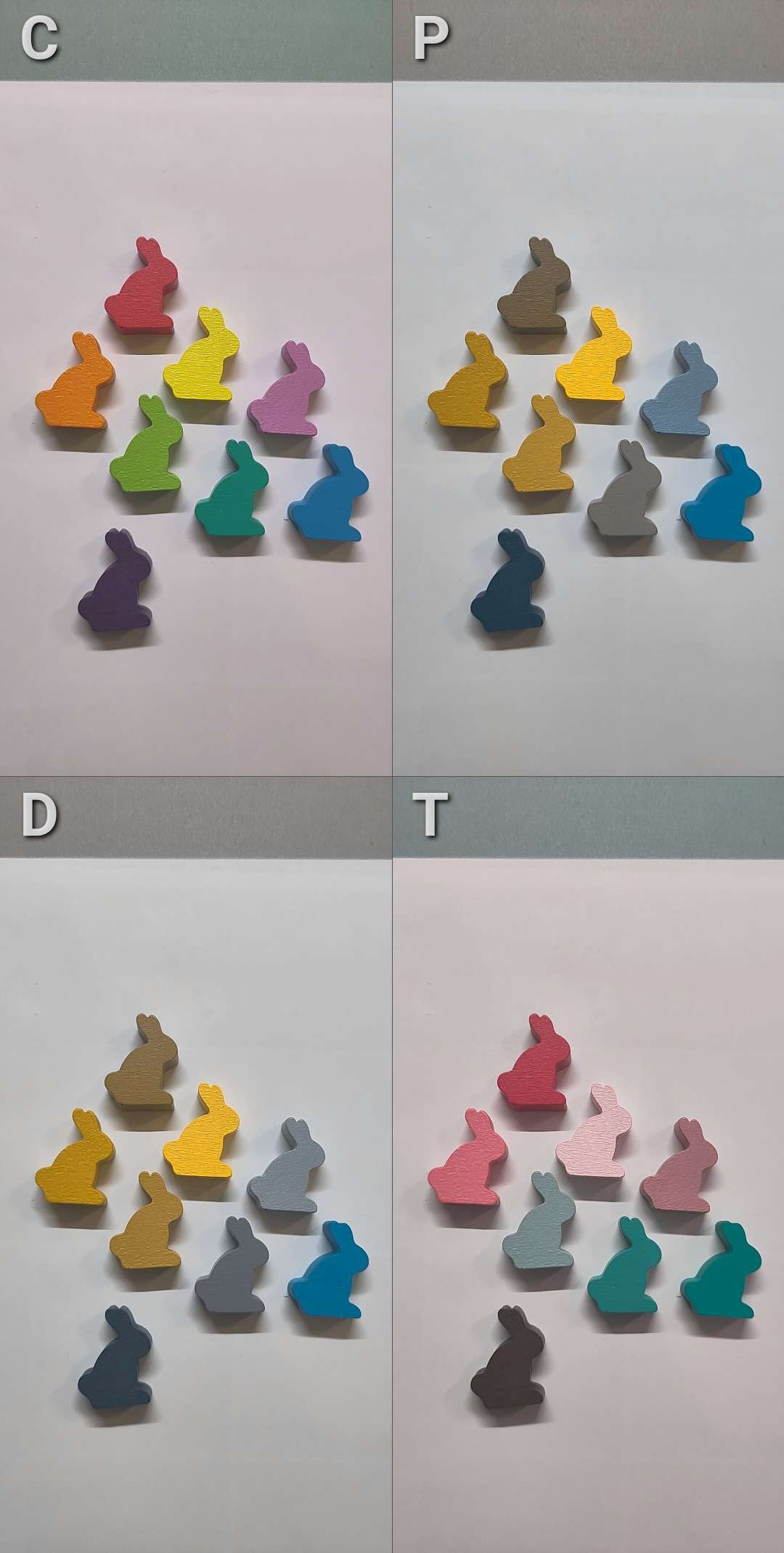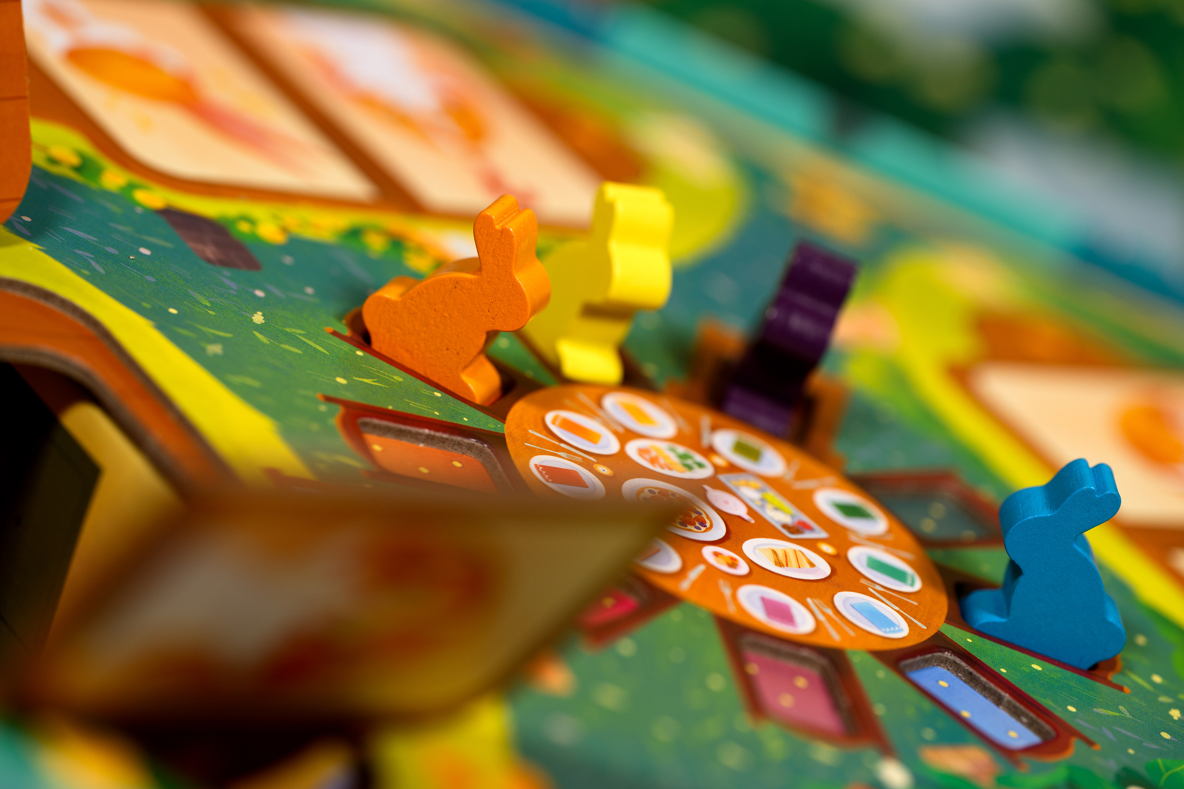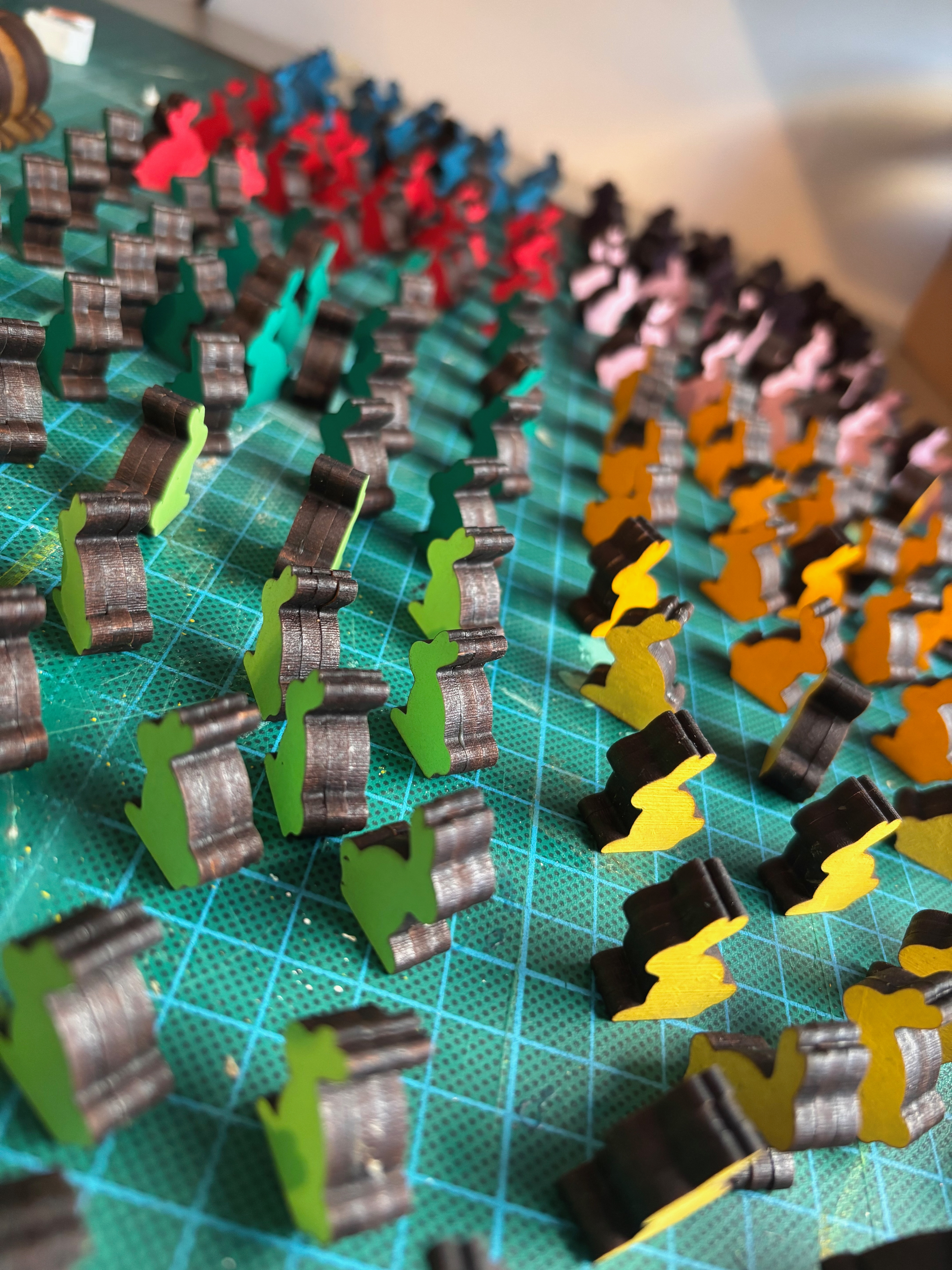 Les lapins ont la même silhouette que le reste de la gamme Dixit. Cependant, j'ai soigneusement choisi leurs couleurs. De nouvelles teintes pour un nouveau jeu, qui s'accordent parfaitement avec l'univers coloré de Dixit Kids, tout en offrant des contrastes suffisamment forts pour qu'un maximum de personnes atteintes de daltonisme puissent différencier les meeples entre eux. Ce n'est pas un aspect essentiel de la mécanique de jeu, mais pour des enfants, le simple fait de pouvoir identifier clairement les lapins peut fluidifier l'expérience de jeu.