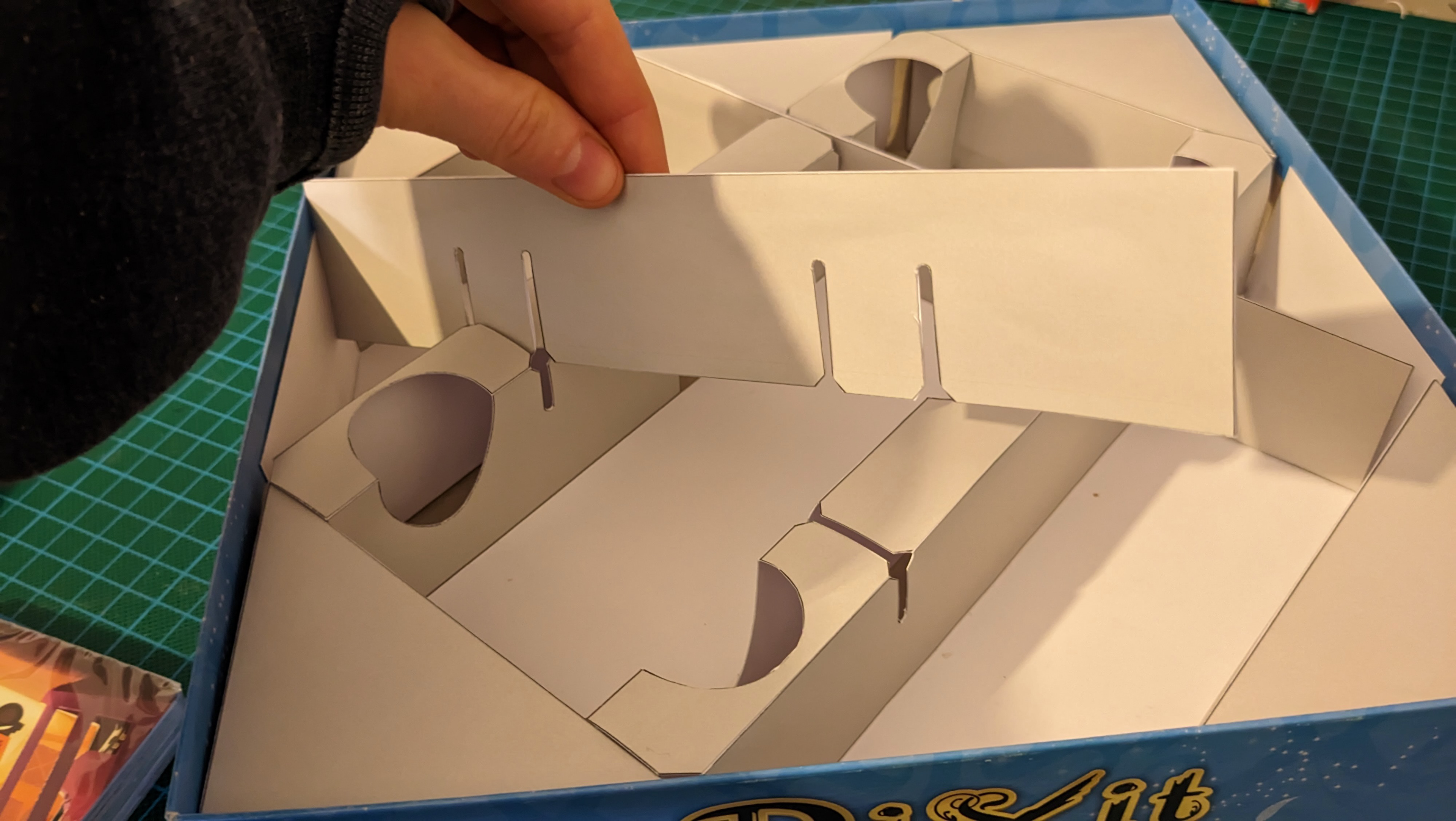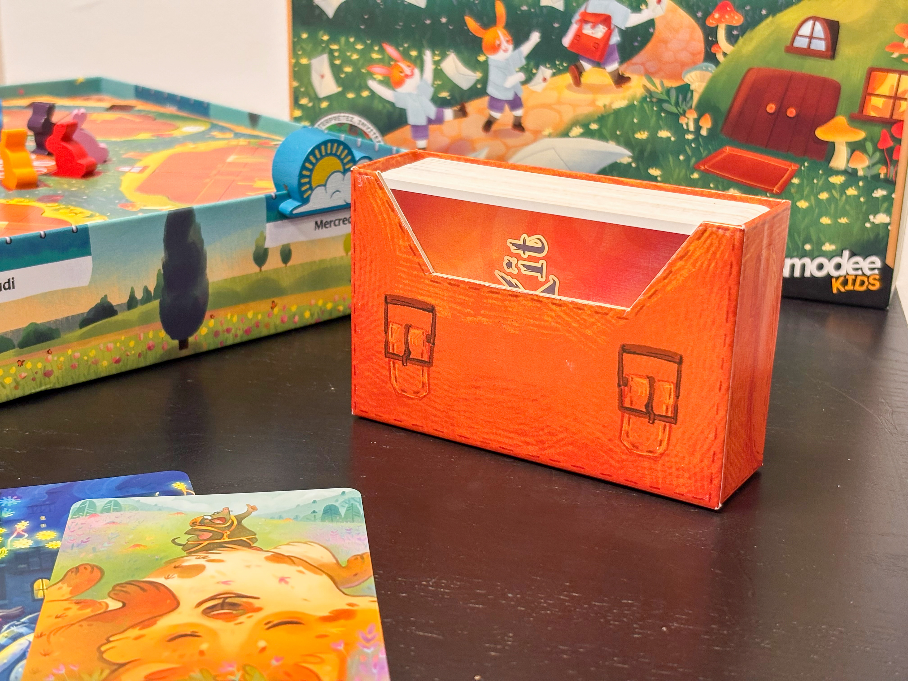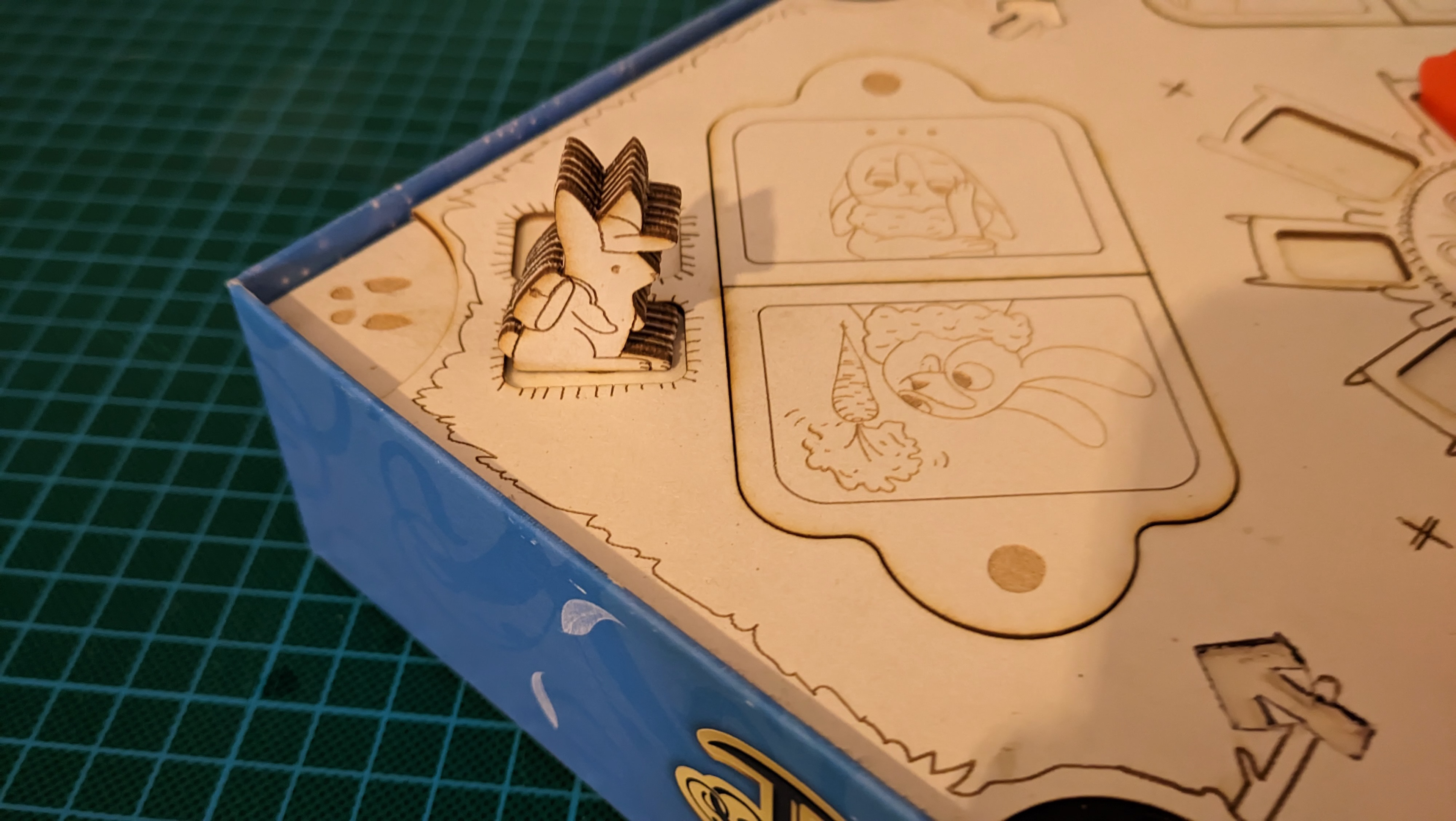 Il faut que le plateau soit bien calé dans la boîte, car si on s'appuie dans un angle et que le plateau bascule en entier… il faut relancer une partie ! Avec des enfants, ce genre d'accident arrive vite. Et avec tout ça, où ranger les cartes ? Les terriers sont trop petits pour les accueillir. C'est aussi l'élément le plus lourd du jeu : comment s'assurer qu'il ne détruise pas l'insert lors du transport ? Mes premières versions de l'insert étaient bien trop complexes, mais elles ont permis de tester et de trouver des solutions à toutes ces problématiques.