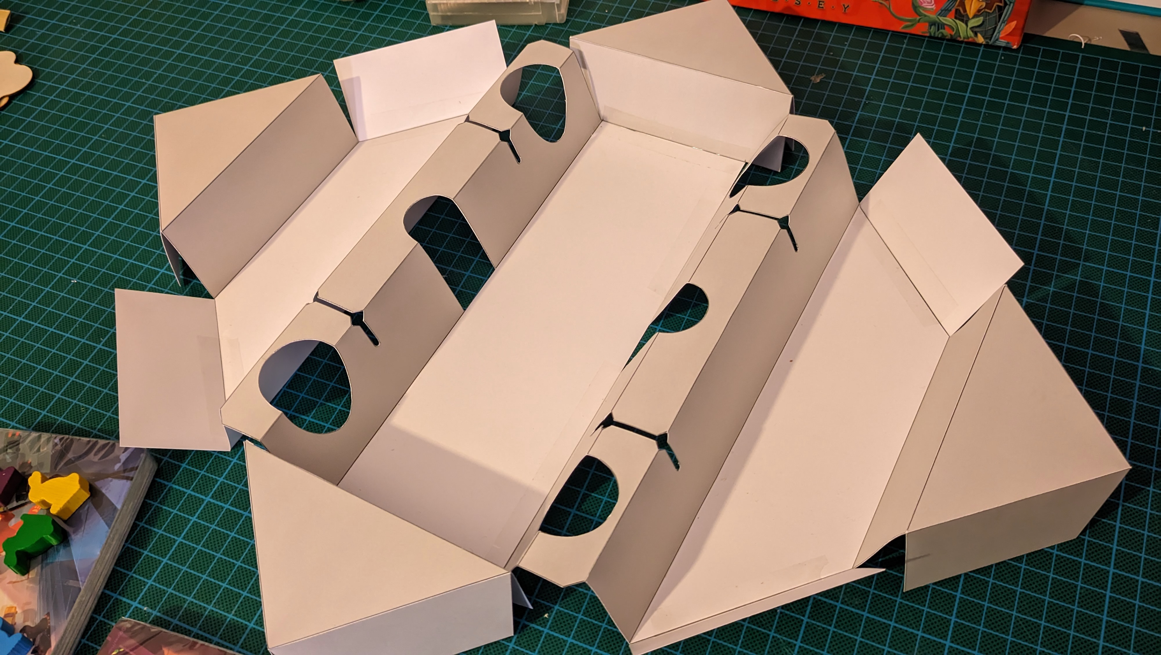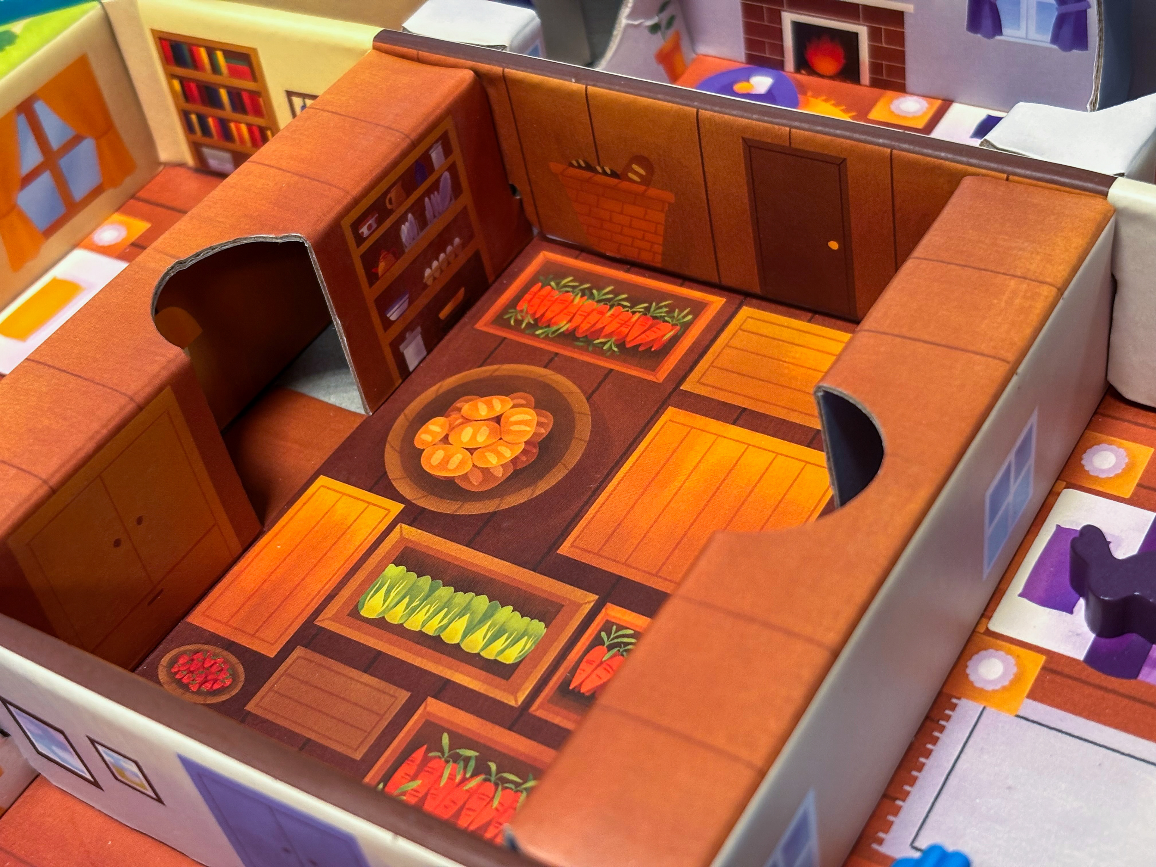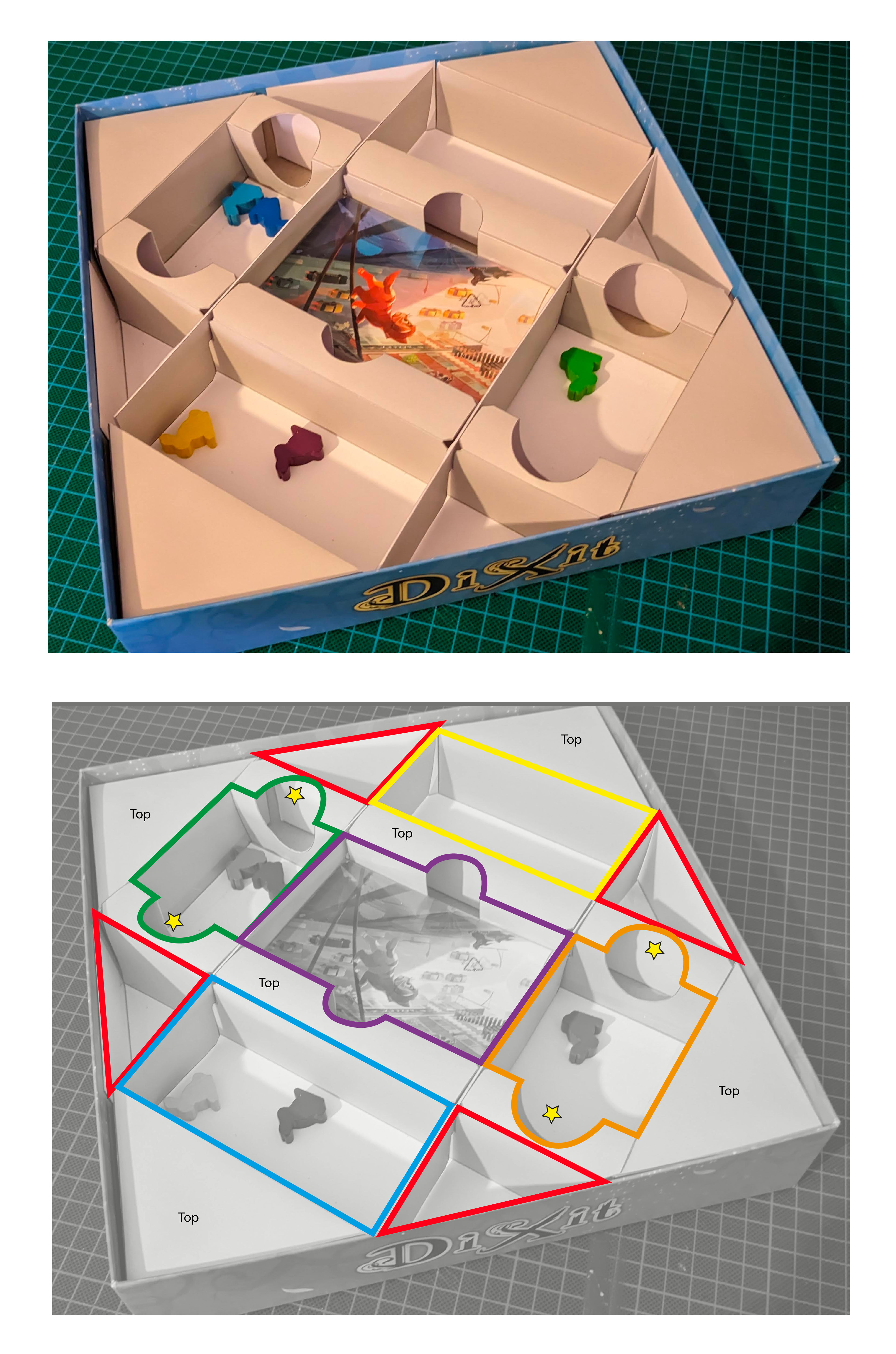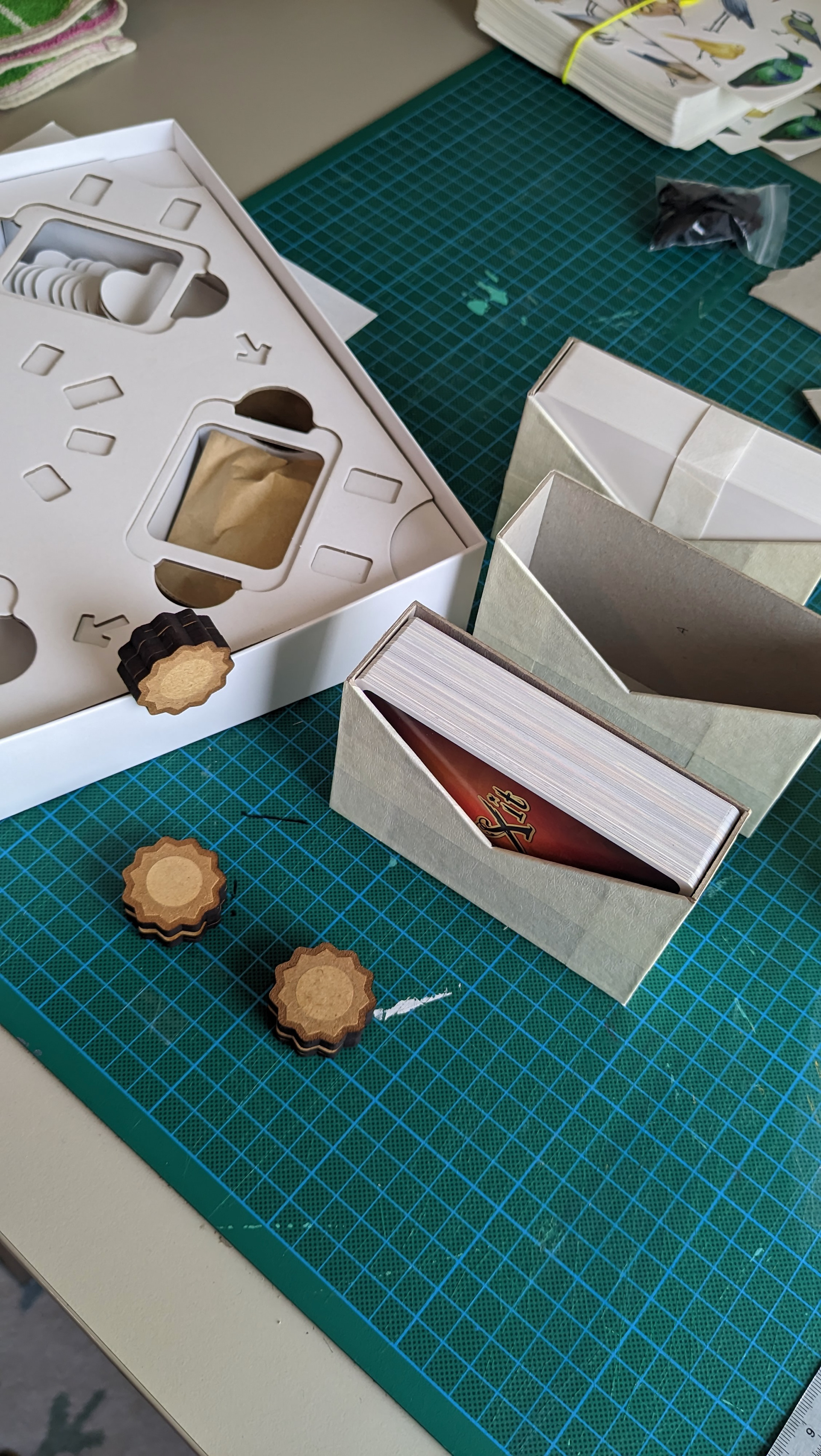 Il faut que le plateau soit bien calé dans la boîte, car si on s'appuie dans un angle et que le plateau bascule en entier… il faut relancer une partie ! Avec des enfants, ce genre d'accident arrive vite. Et avec tout ça, où ranger les cartes ? Les terriers sont trop petits pour les accueillir. C'est aussi l'élément le plus lourd du jeu : comment s'assurer qu'il ne détruise pas l'insert lors du transport ? Mes premières versions de l'insert étaient bien trop complexes, mais elles ont permis de tester et de trouver des solutions à toutes ces problématiques.