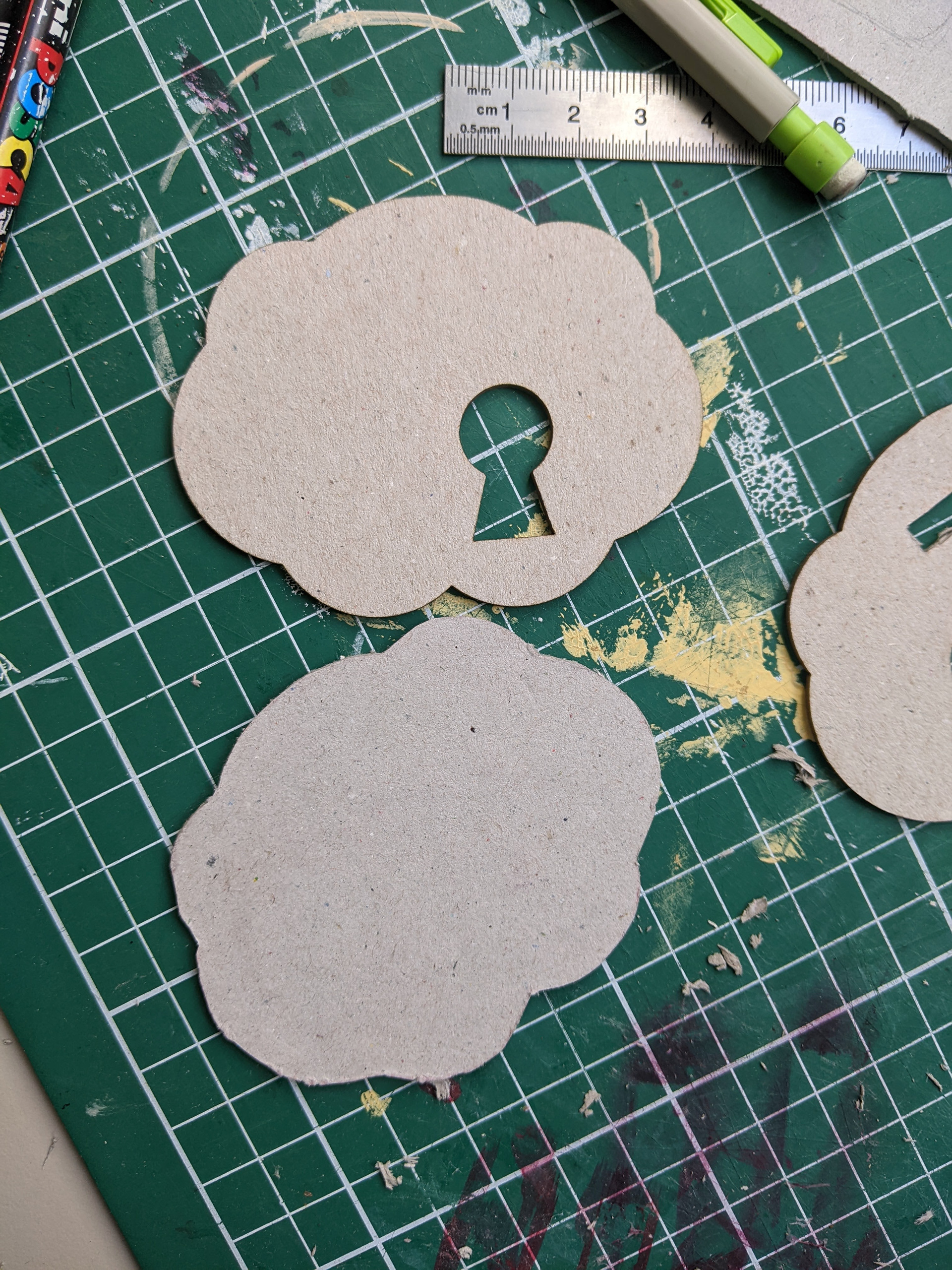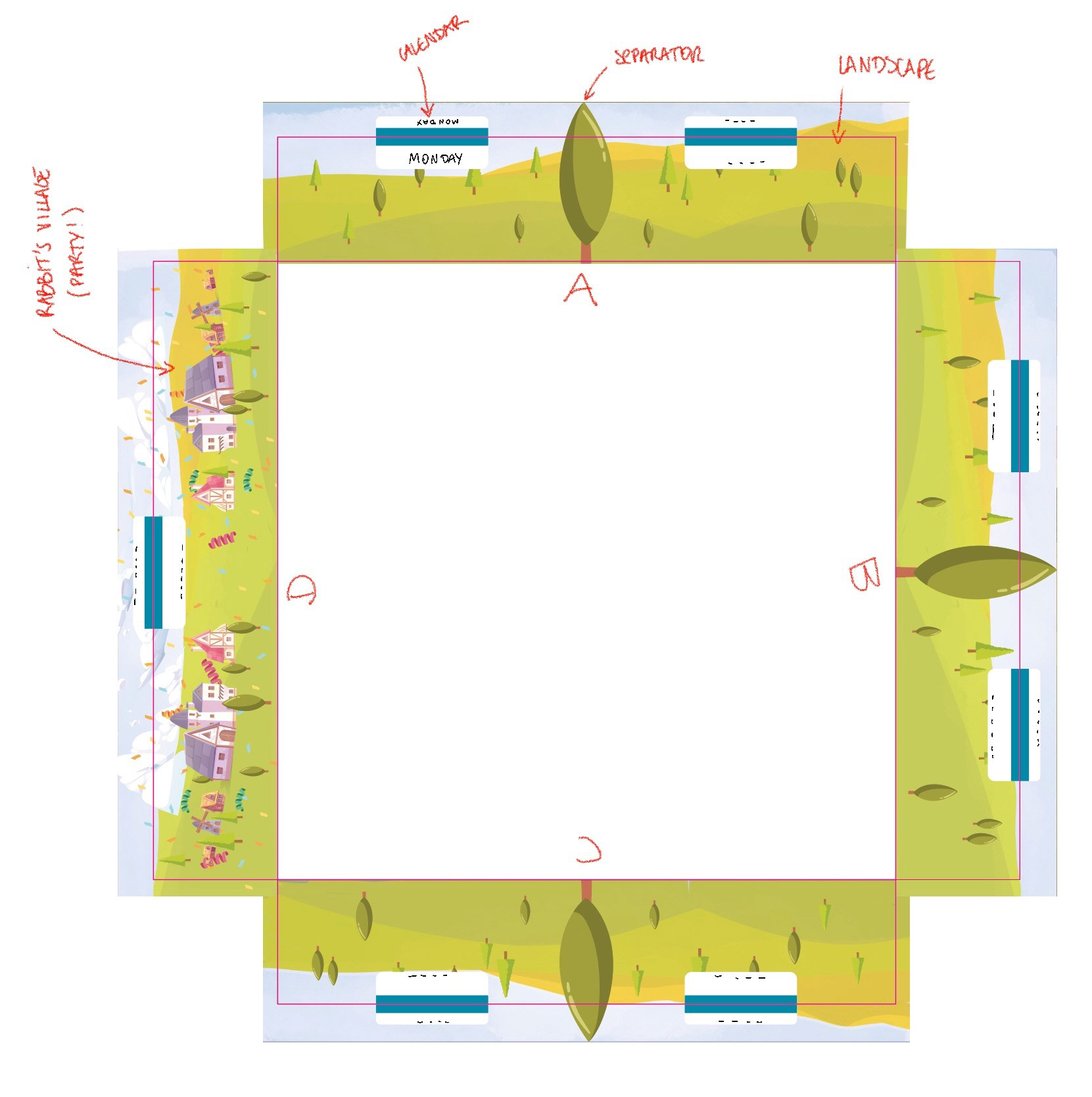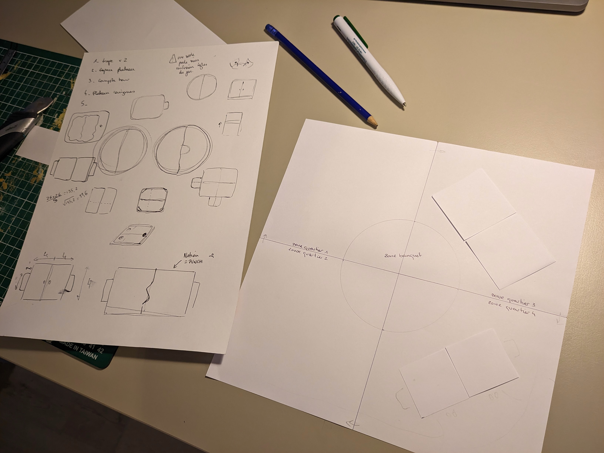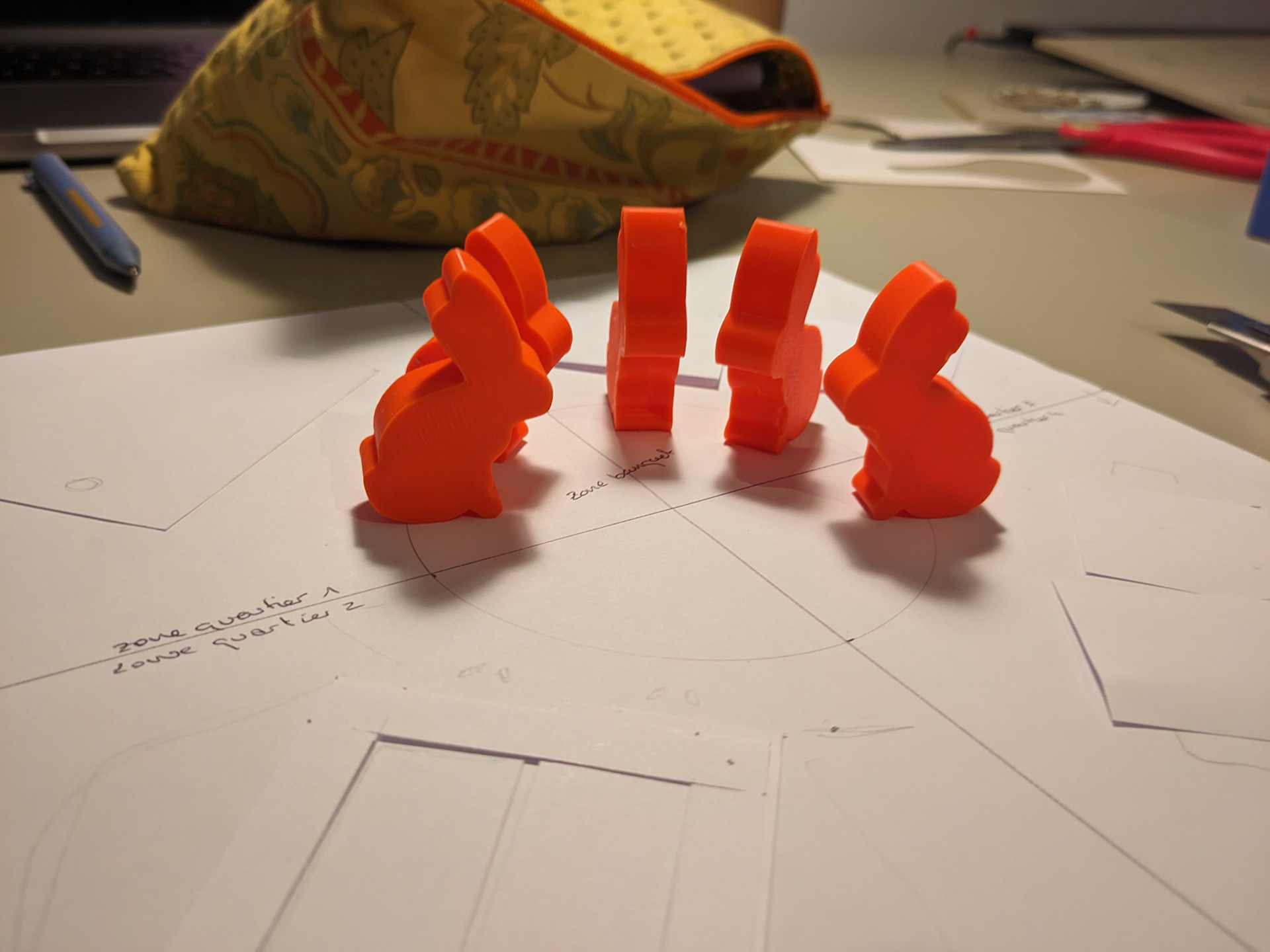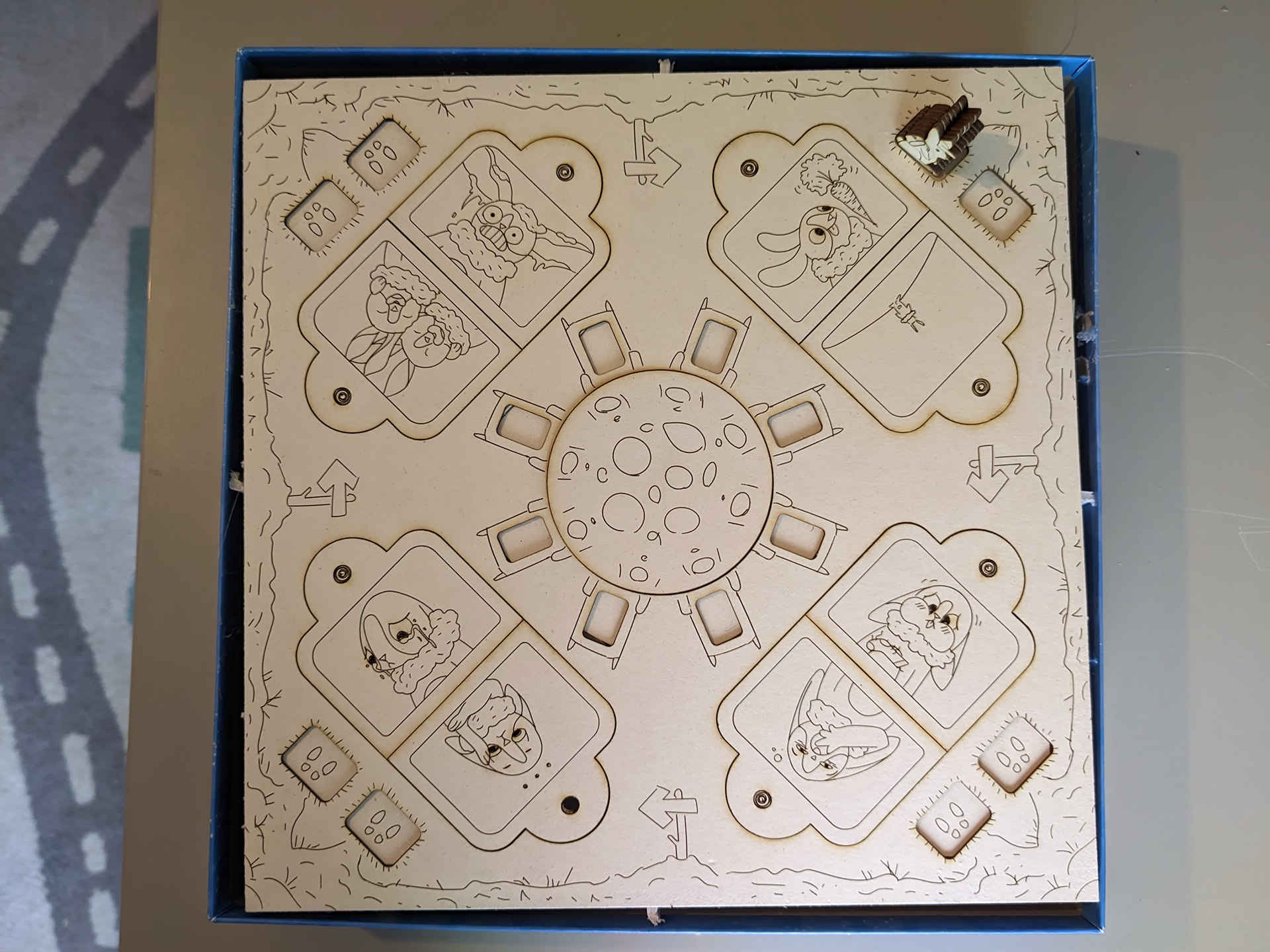 Une fois que j'ai validé le système de portes, j'ai dû réussir à tout faire tenir sur le plateau. Ce plateau doit raconter l'histoire, faire rêver… tout en intégrant tous les éléments ergonomiques nécessaires ! Les quatre doubles-terriers, avec chacun deux paillassons et un emplacement de départ. Sur la zone centrale, l'idée de créer une table où positionner les lapins invités est venue très vite et très naturellement.