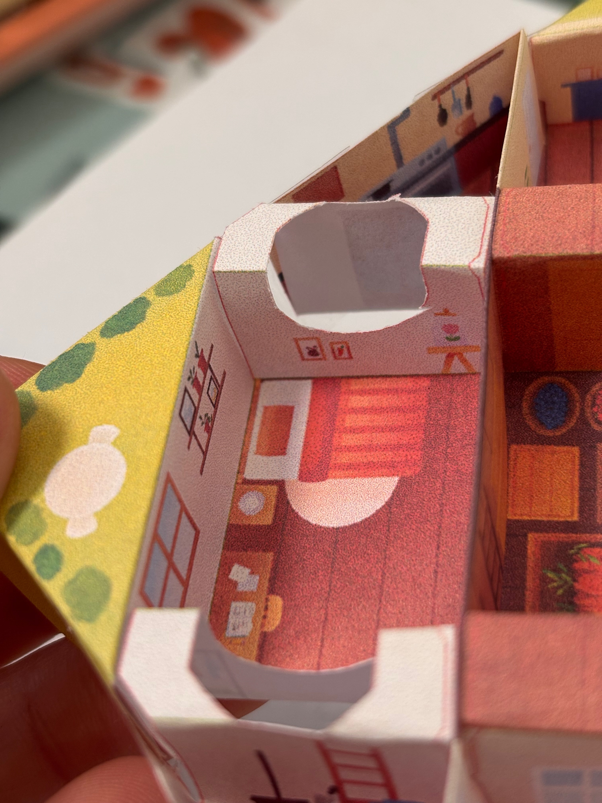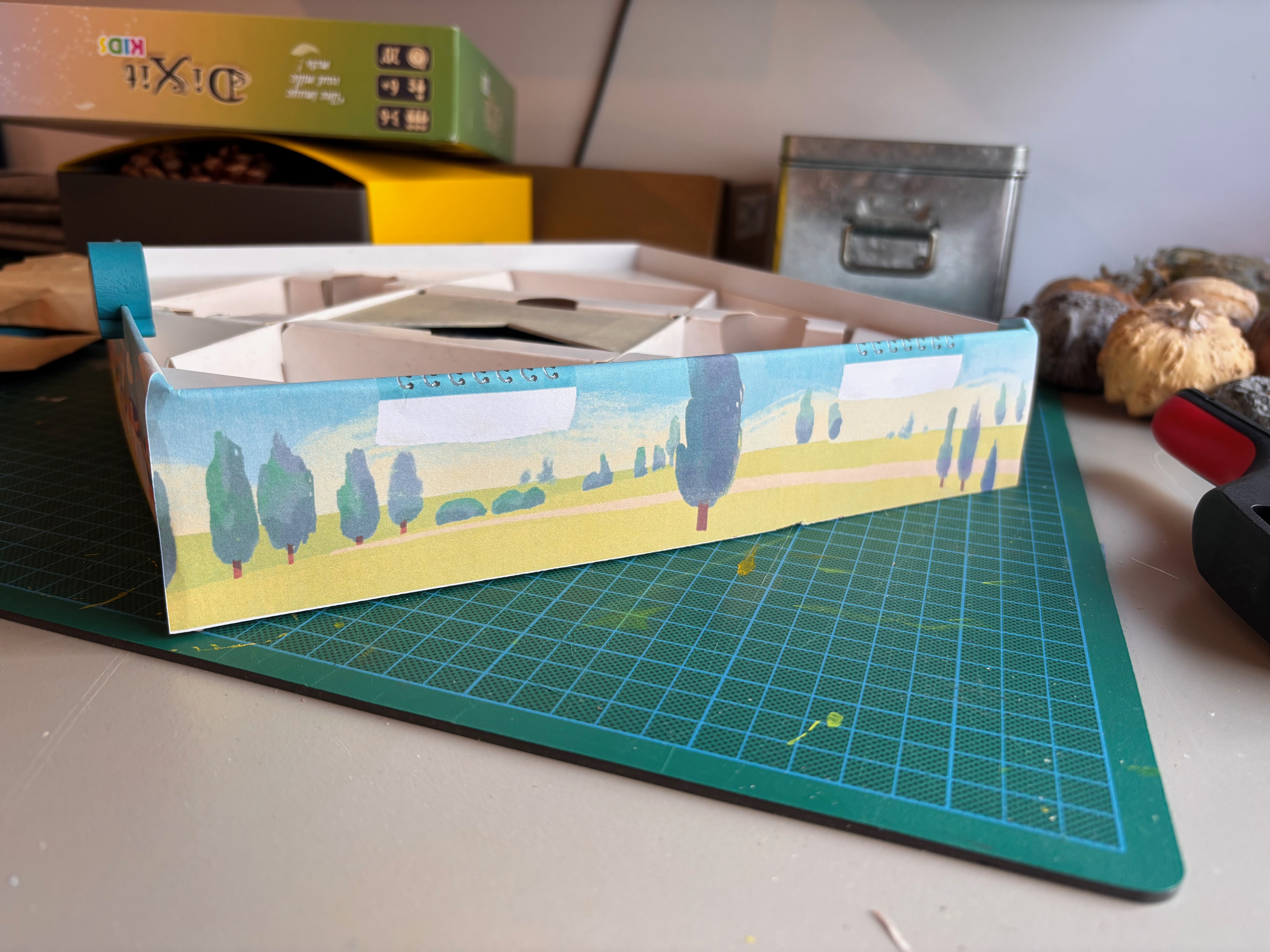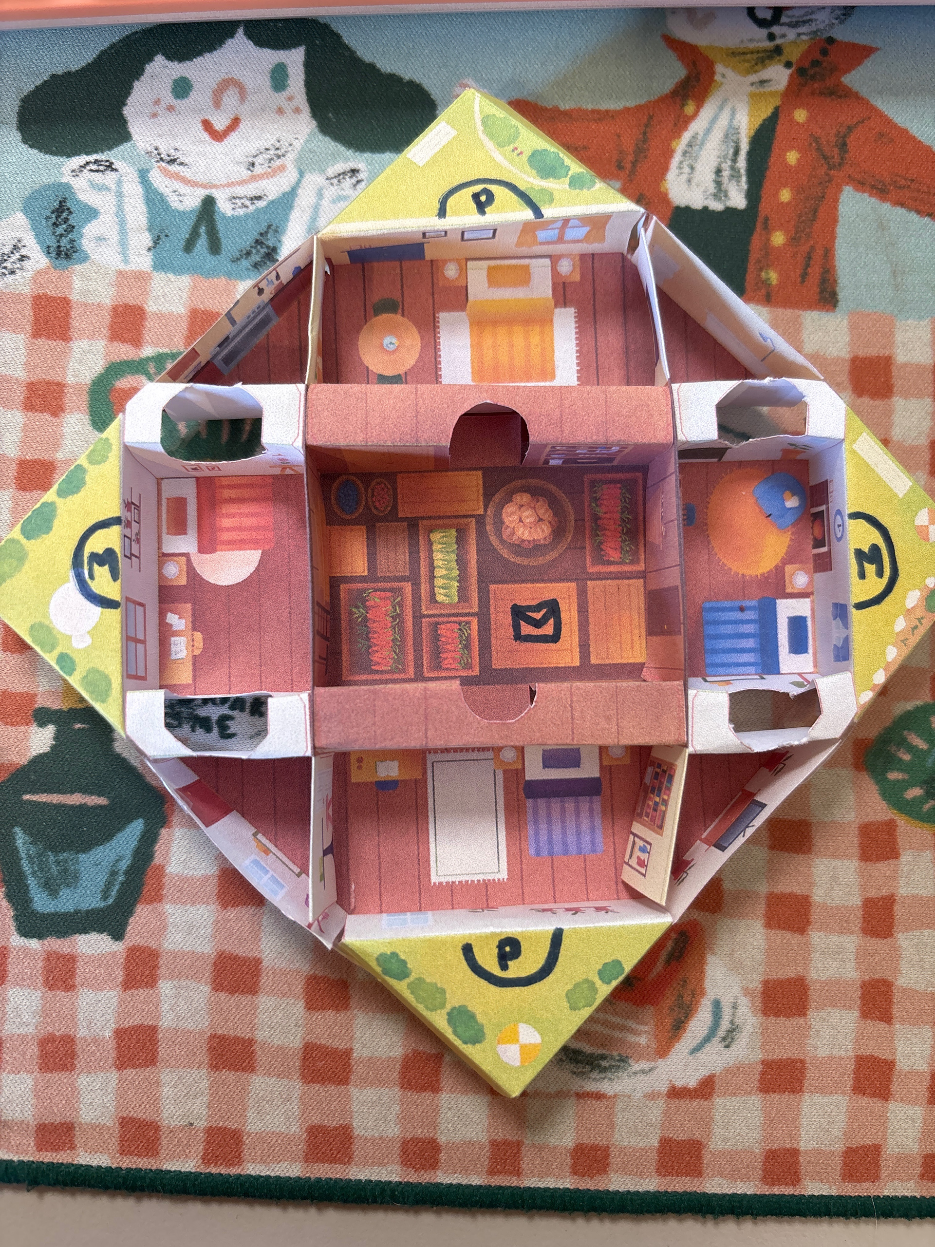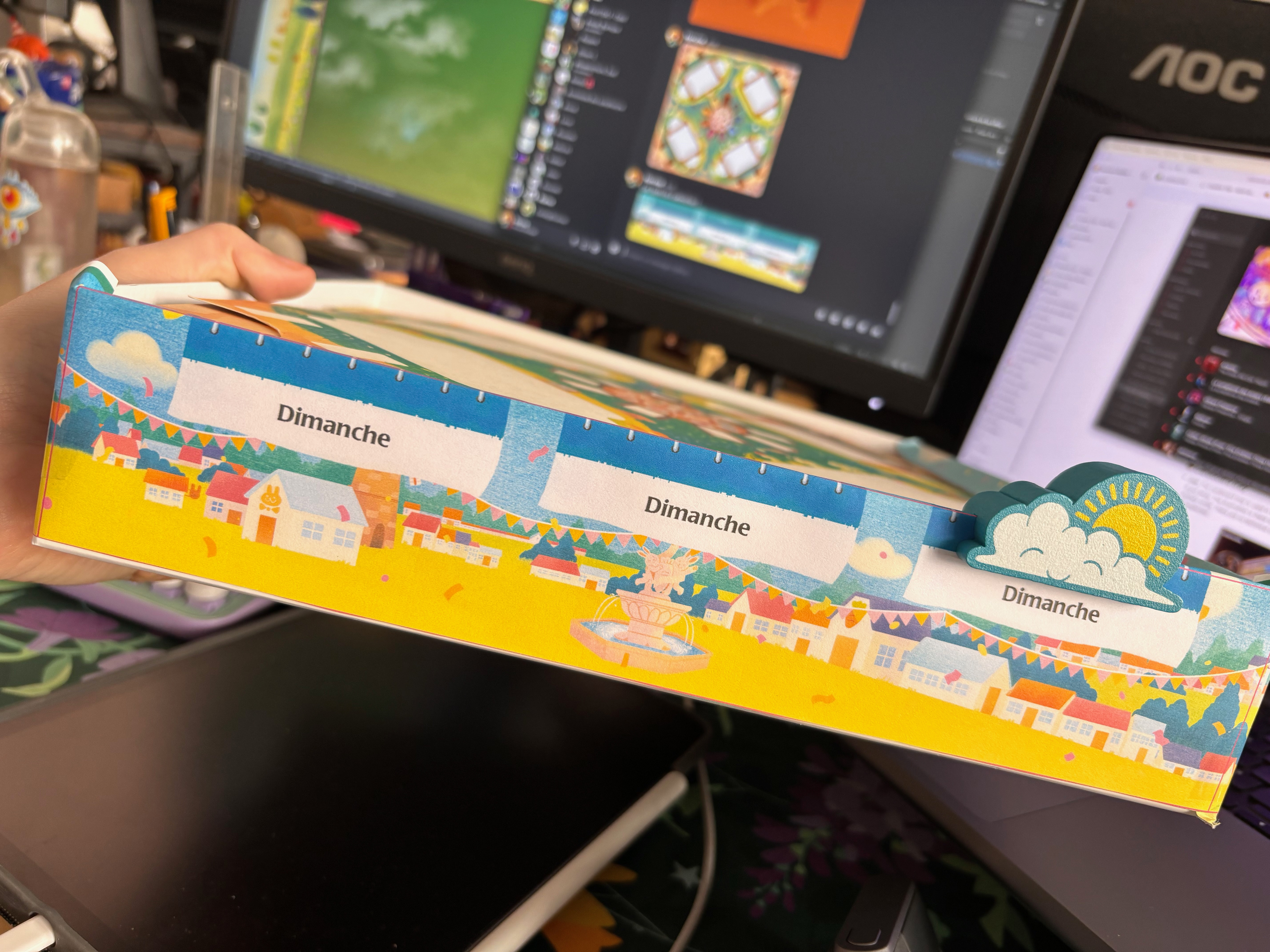 Après la recherche et le développement, j'ai dû transmettre les instructions à l'illustratrice Emily Paik pour qu'elle puisse habiller ce patron complexe. Pour quelqu'un qui n'a jamais illustré d'objet en volume comme un jeu de société, comprendre la géométrie de ce patron peut être un vrai défi ! On a échangé plusieurs fois pour s'assurer que tout soit clair, et les petits ajustements ont très vite été réglés.