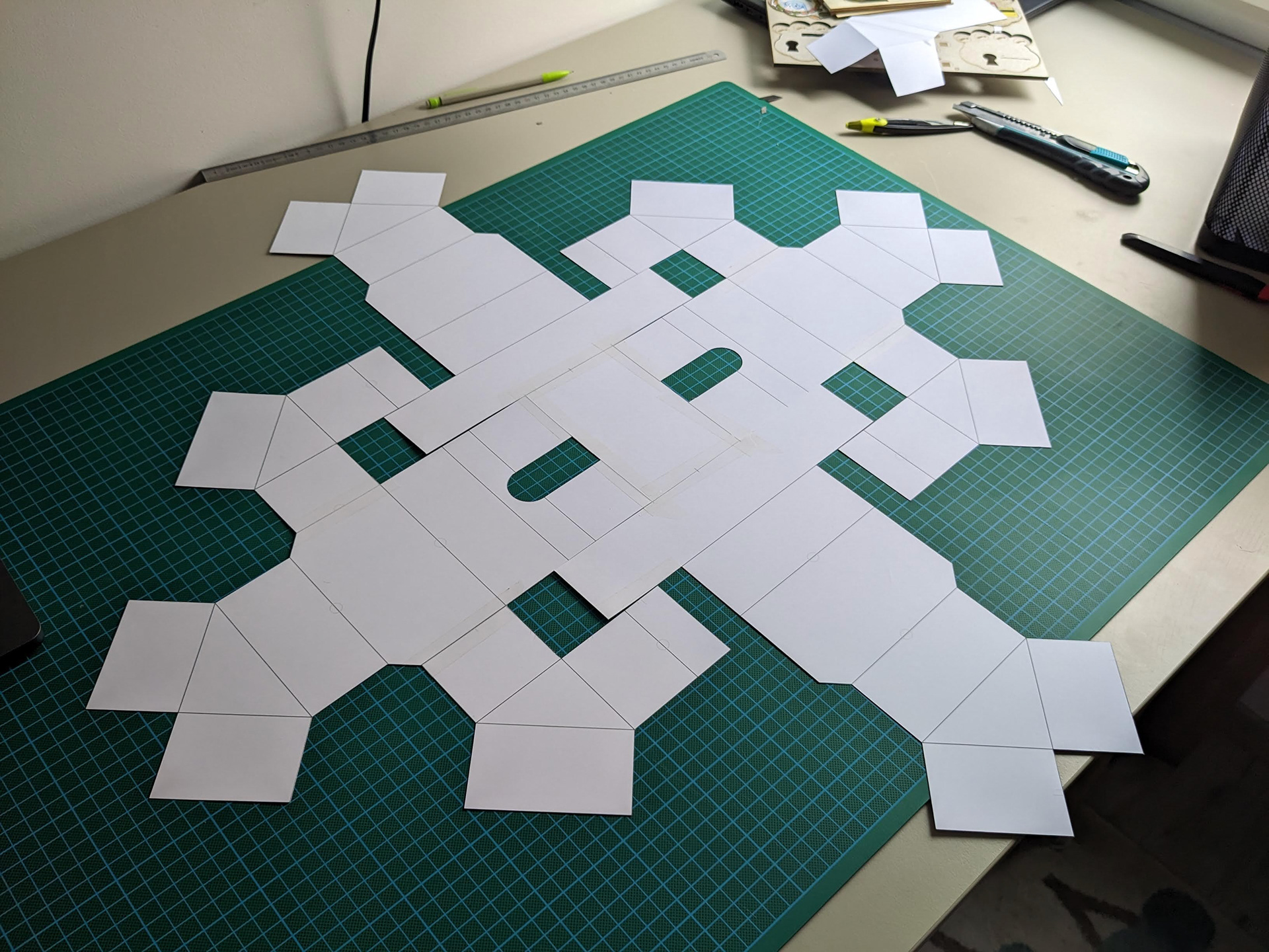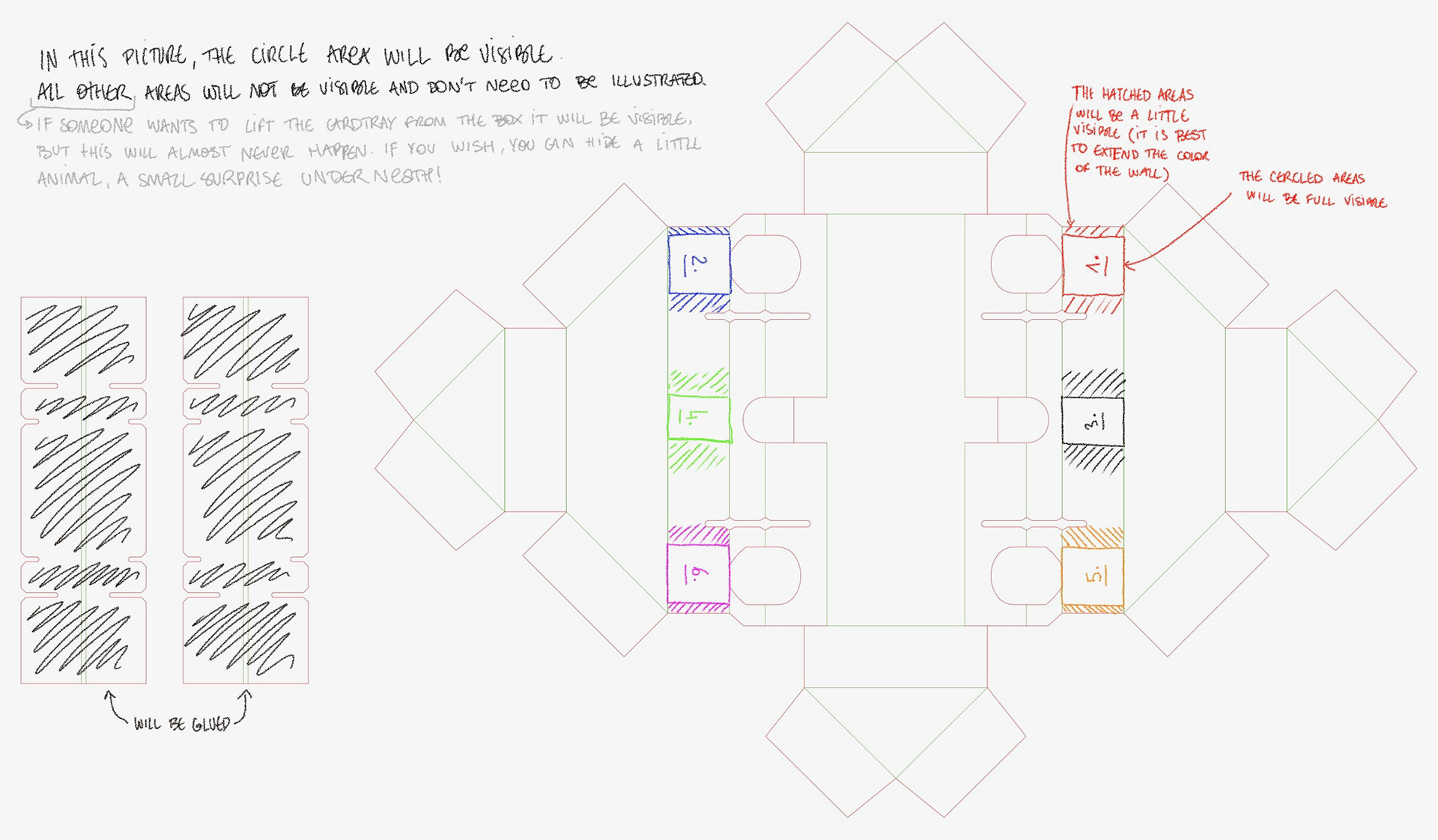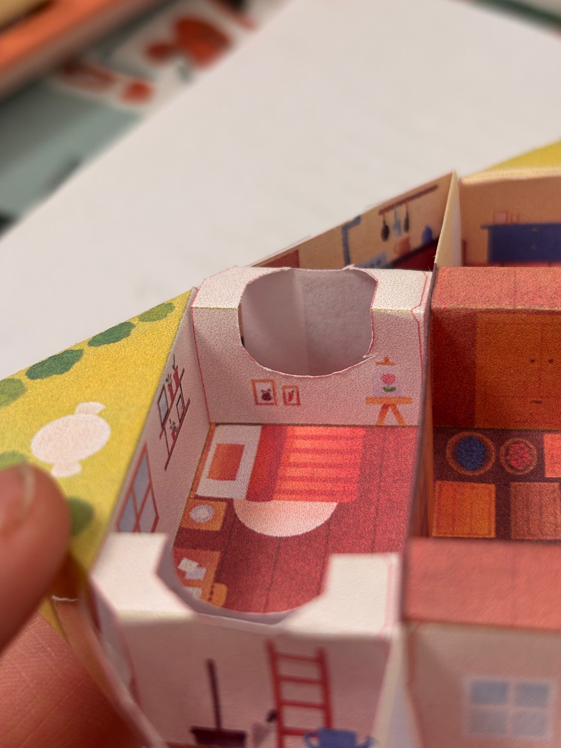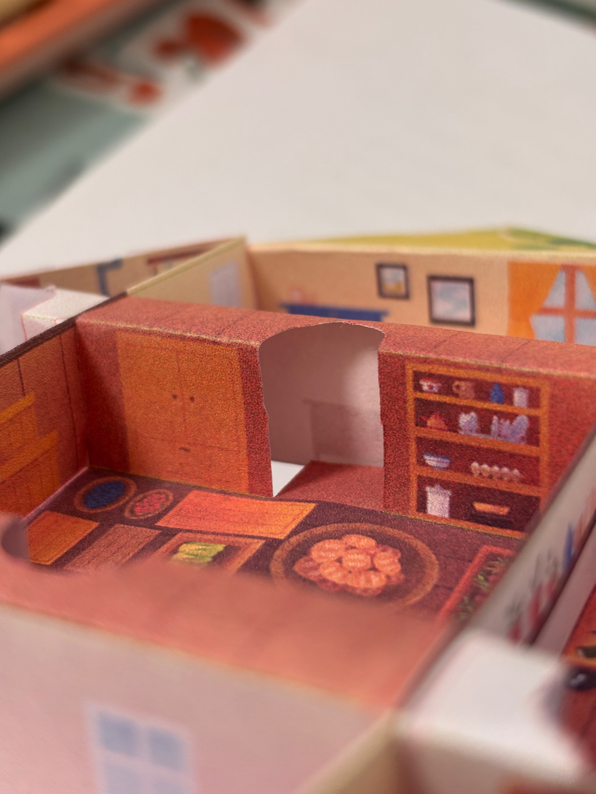 Après la recherche et le développement, j'ai dû transmettre les instructions à l'illustratrice Emily Paik pour qu'elle puisse habiller ce patron complexe. Pour quelqu'un qui n'a jamais illustré d'objet en volume comme un jeu de société, comprendre la géométrie de ce patron peut être un vrai défi ! On a échangé plusieurs fois pour s'assurer que tout soit clair, et les petits ajustements ont très vite été réglés.