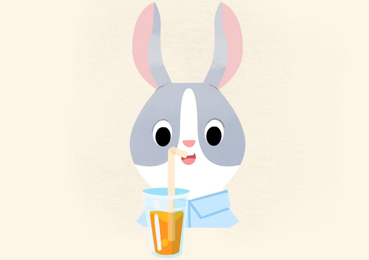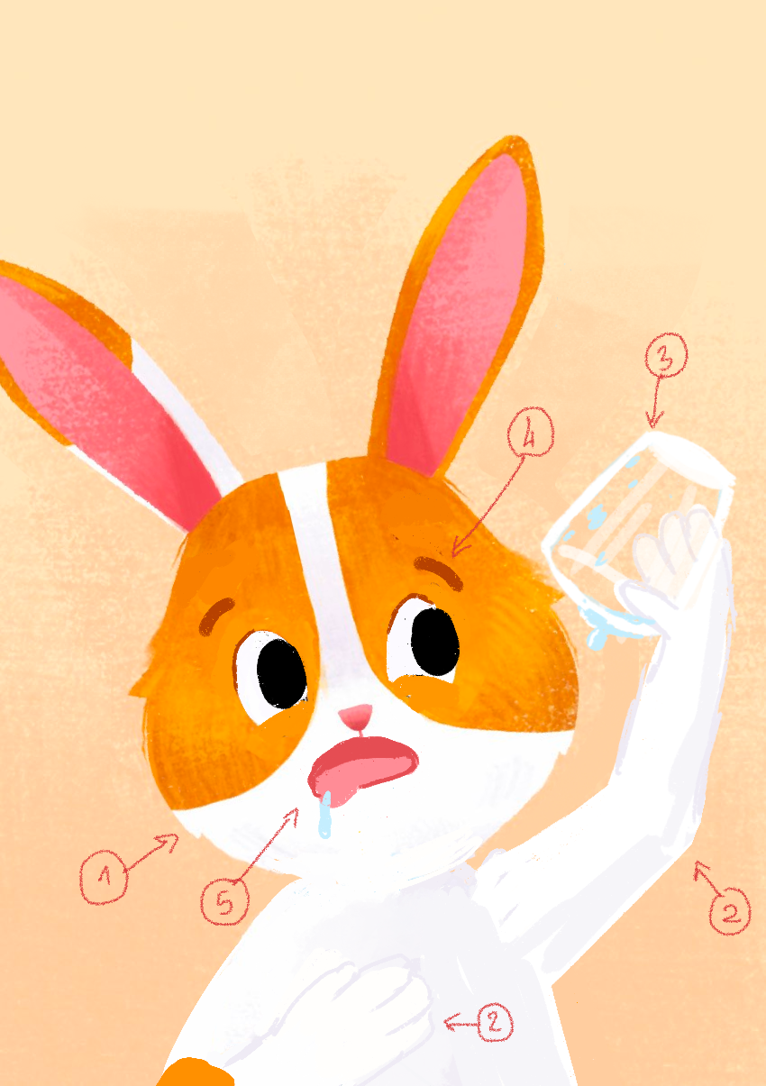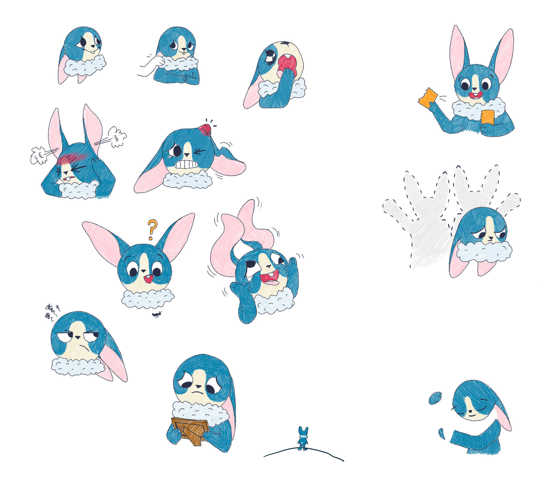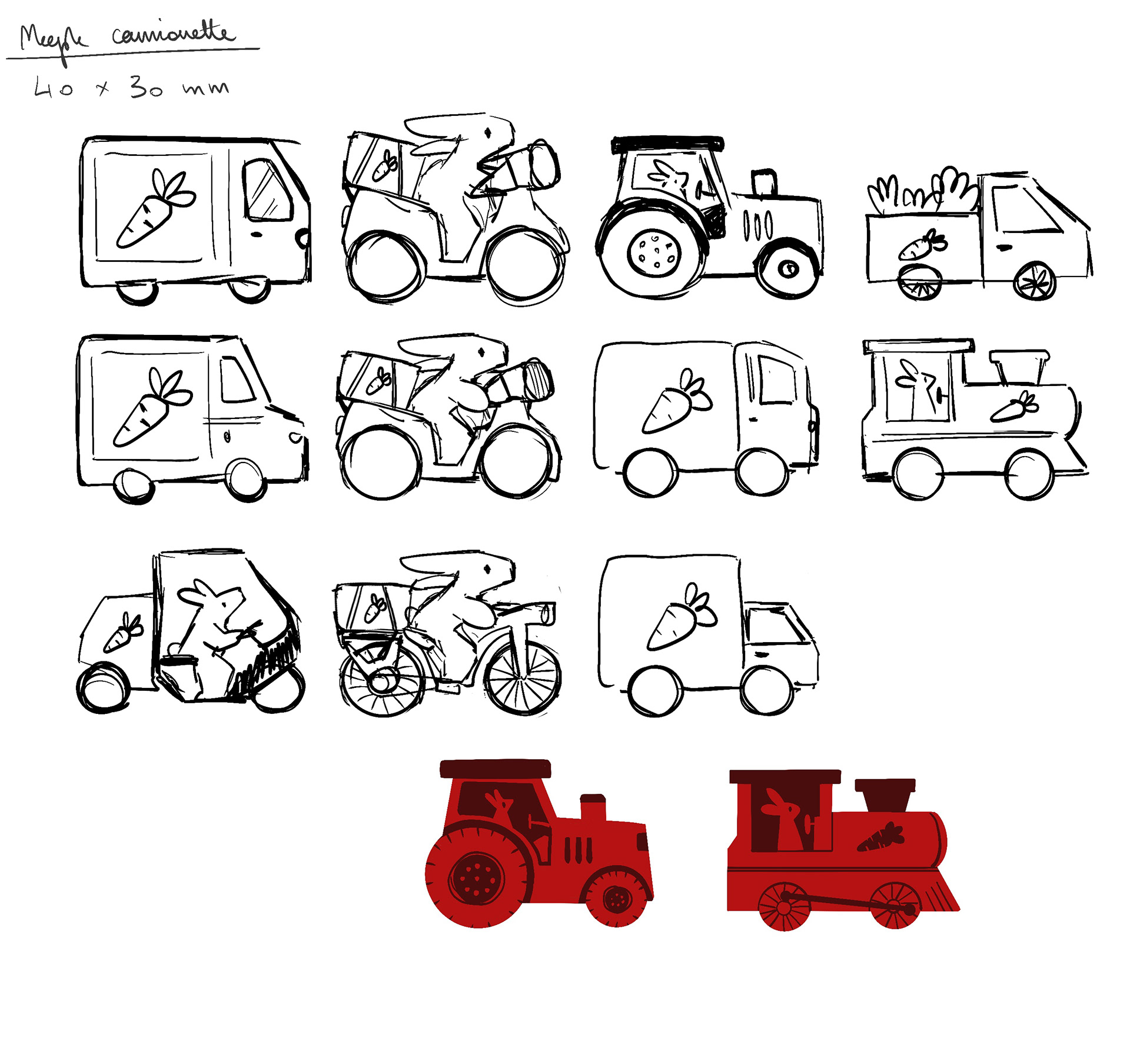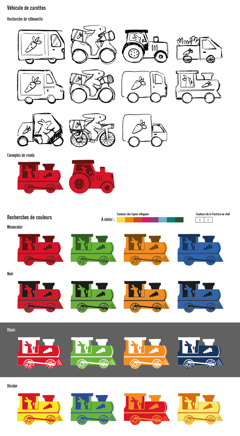 Après avoir déterminé les notions présentes dans le jeu, j'ai illustré de nombreux lapins tests afin de les valider en conditions réelles avant de demander leurs versions finales à l'illustratrice Emily Paik. Le premier lapin illustré a permis de définir son aspect graphique pour le répercuter ensuite sur l'ensemble du jeu. Quelques rares lapins, comme celui-ci, ont eu droit à des changements importants… car tous ont été testés auprès d'enfants et d'adultes pour confirmer, ou non, leur interprétation.