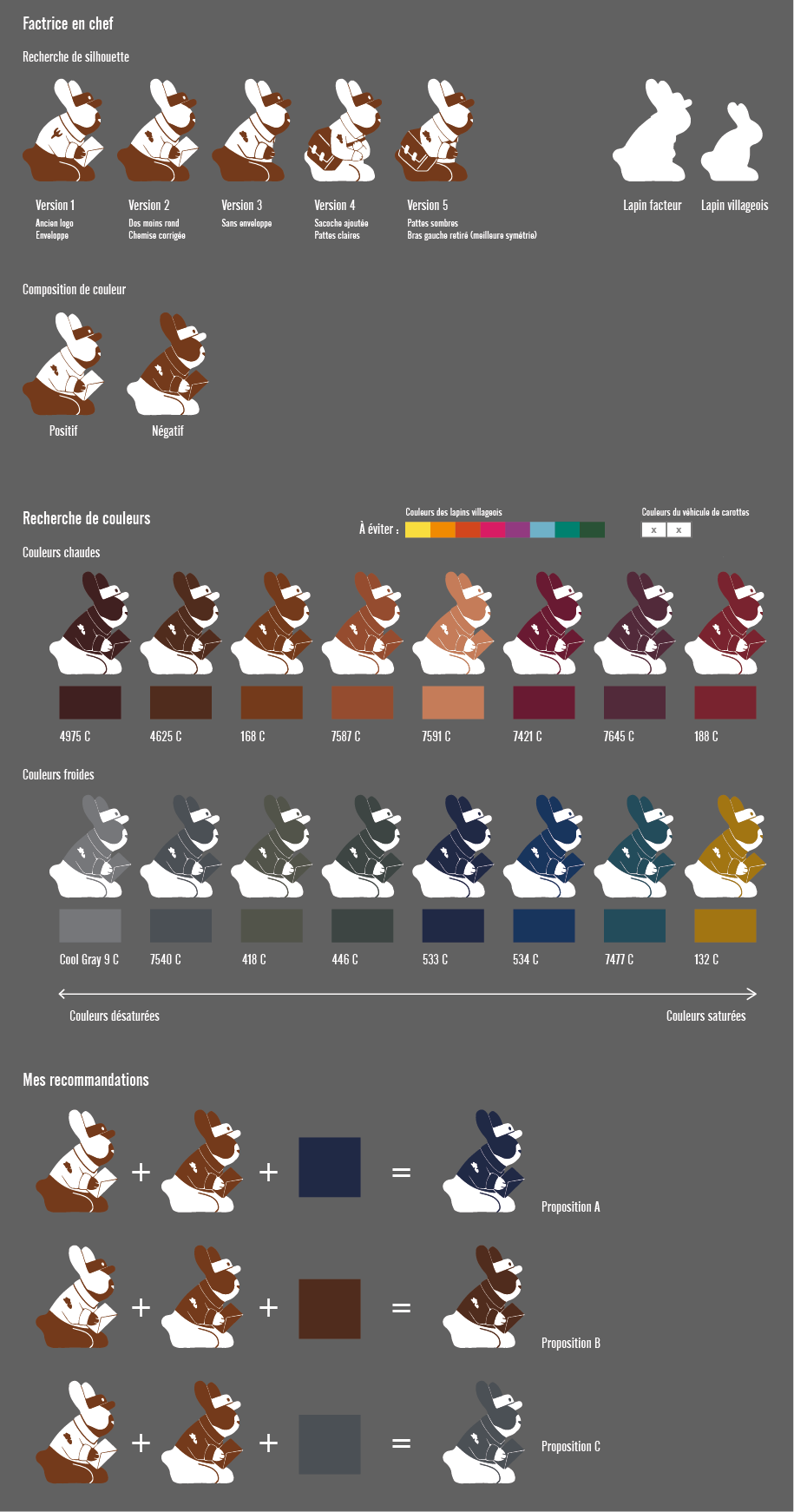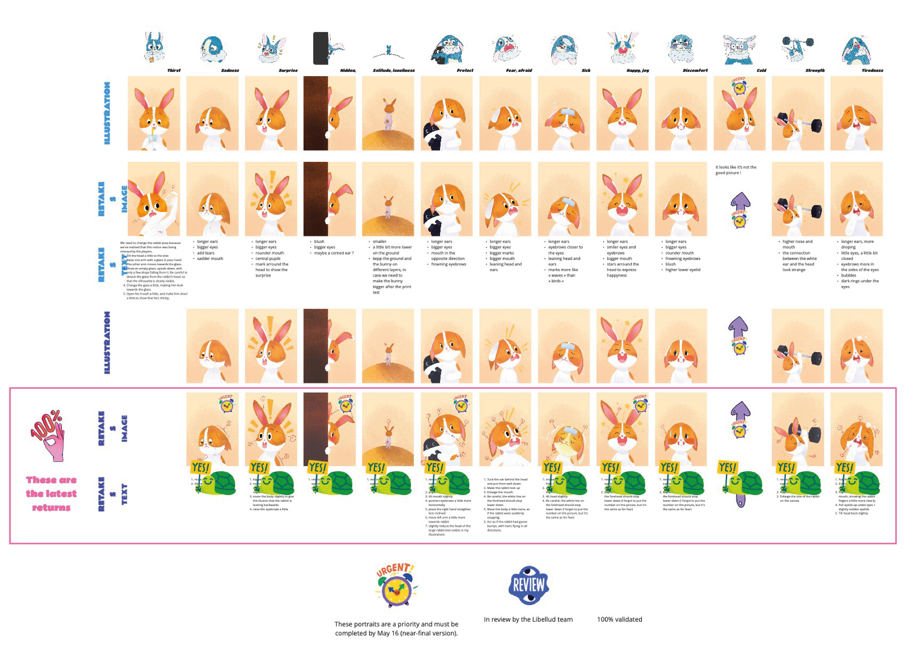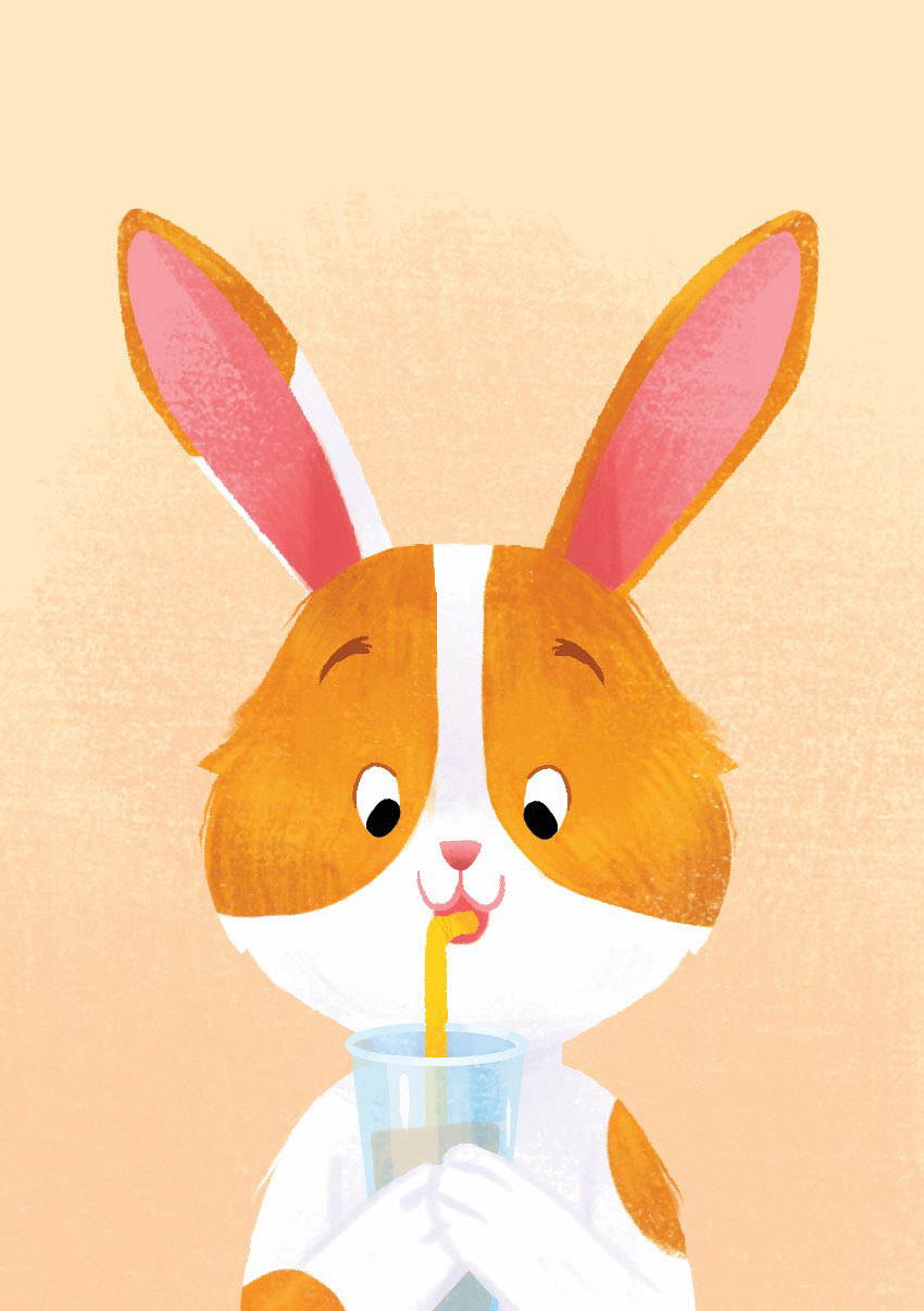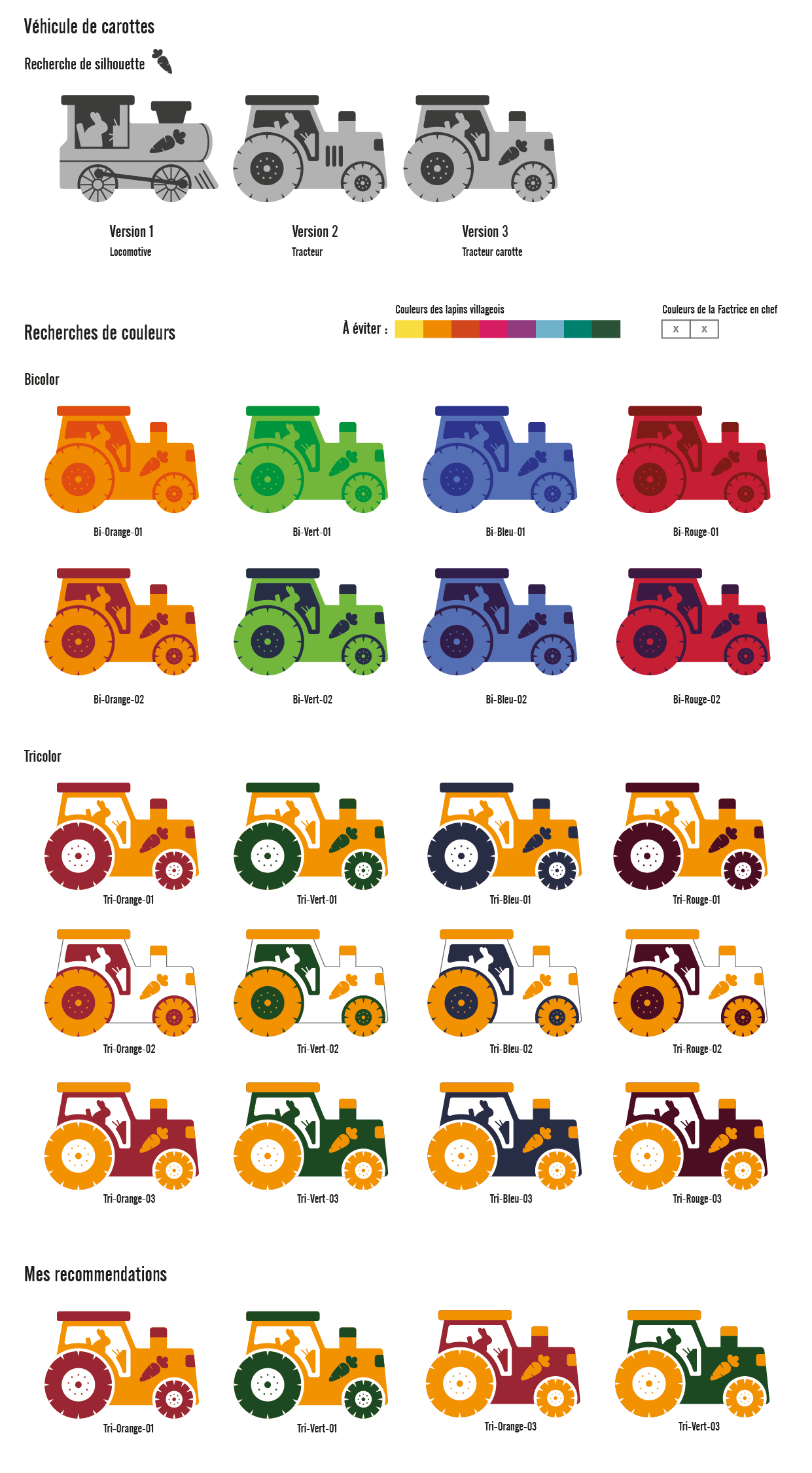 Après avoir déterminé les notions présentes dans le jeu, j'ai illustré de nombreux lapins tests afin de les valider en conditions réelles avant de demander leurs versions finales à l'illustratrice Emily Paik. Le premier lapin illustré a permis de définir son aspect graphique pour le répercuter ensuite sur l'ensemble du jeu. Quelques rares lapins, comme celui-ci, ont eu droit à des changements importants… car tous ont été testés auprès d'enfants et d'adultes pour confirmer, ou non, leur interprétation.
