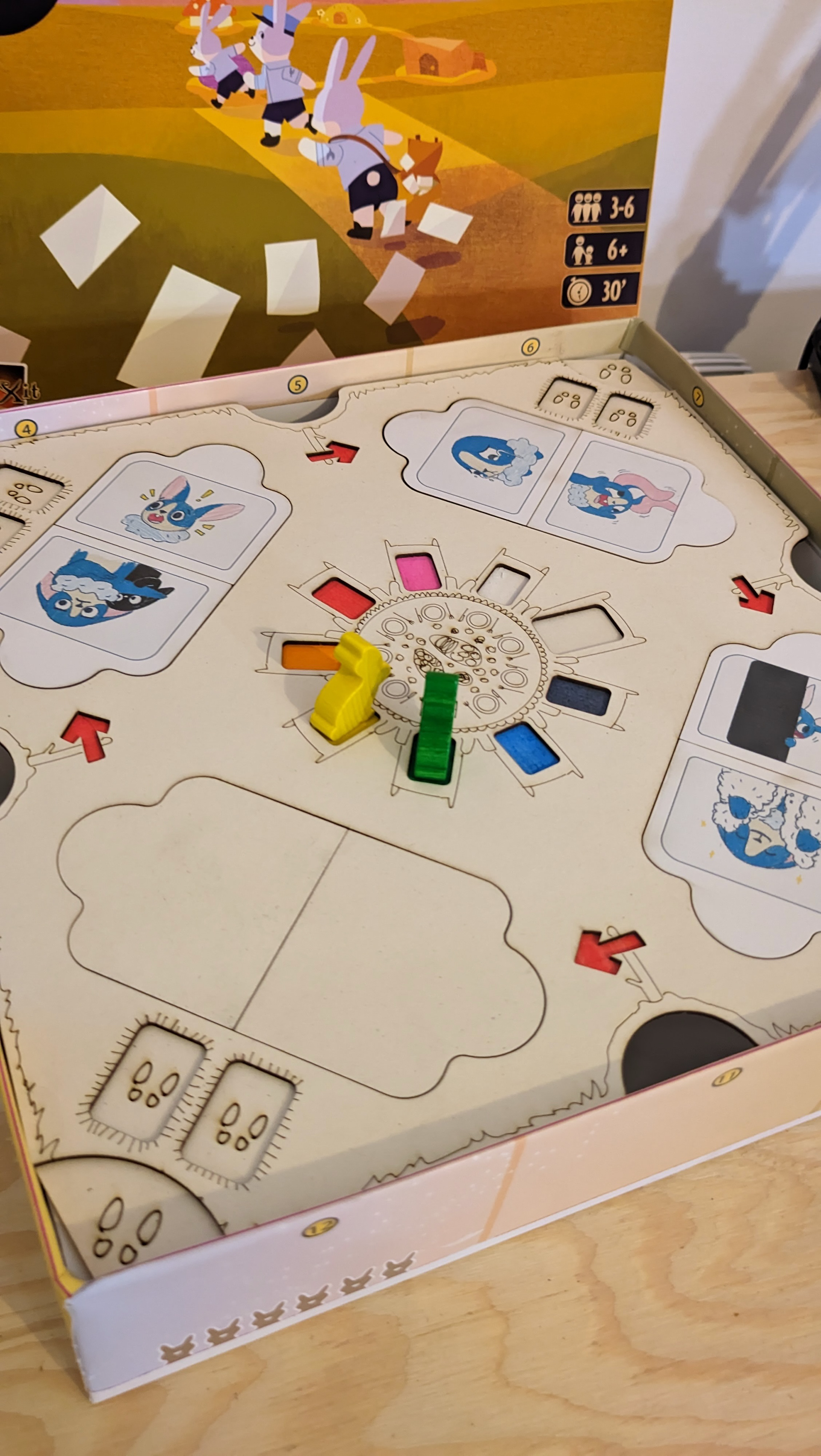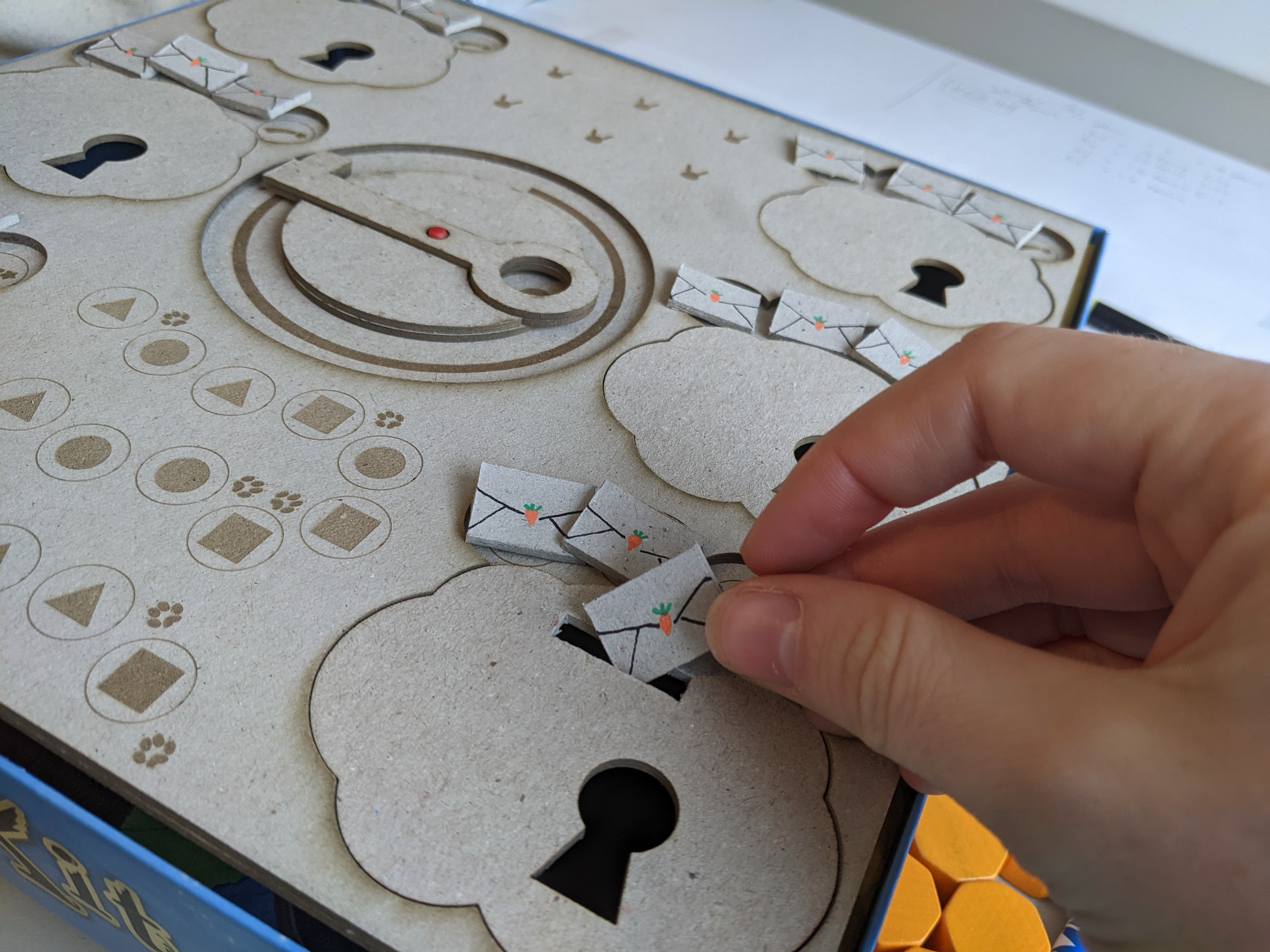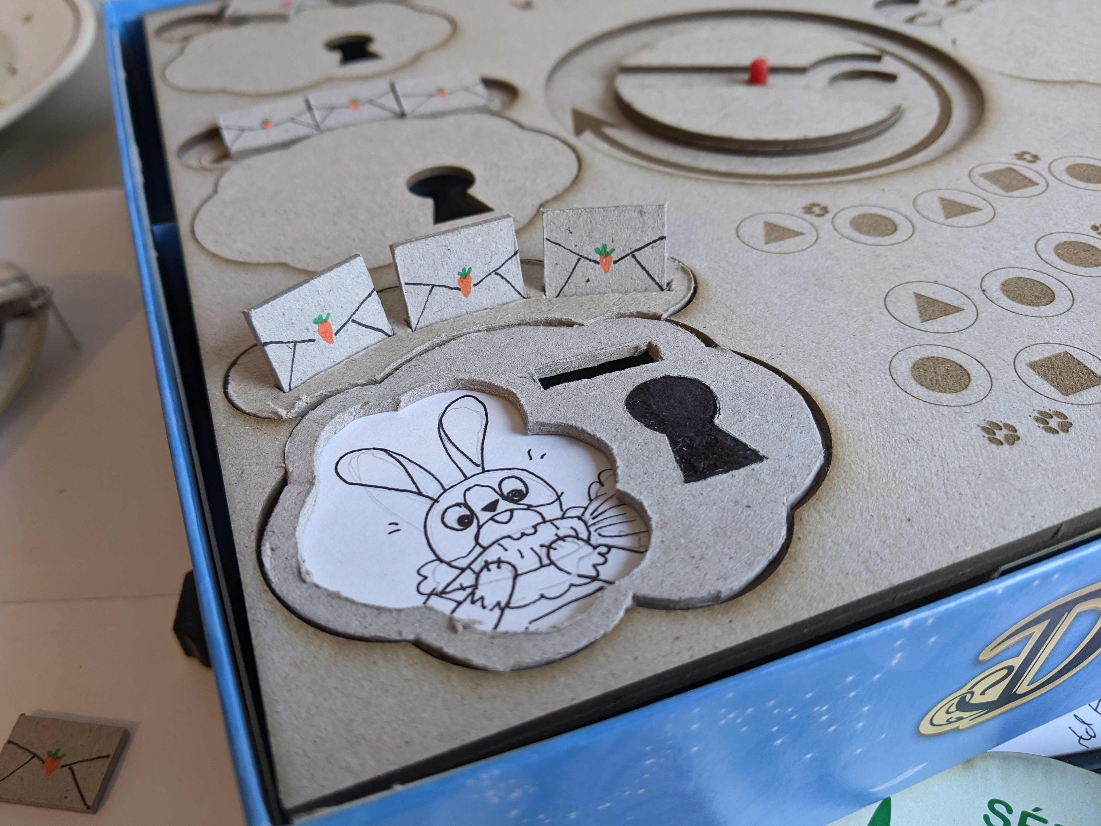 Quand on m'a confié le projet, on jouait déjà dans la boîte avec le plateau posé dessus, avec des cales collées à l'intérieur. La clef que vous voyez au centre du plateau servait à soulever les portes via le trou cadenas. Il fallait défausser un certain nombre de jetons pour réussir à libérer le lapin émotion.