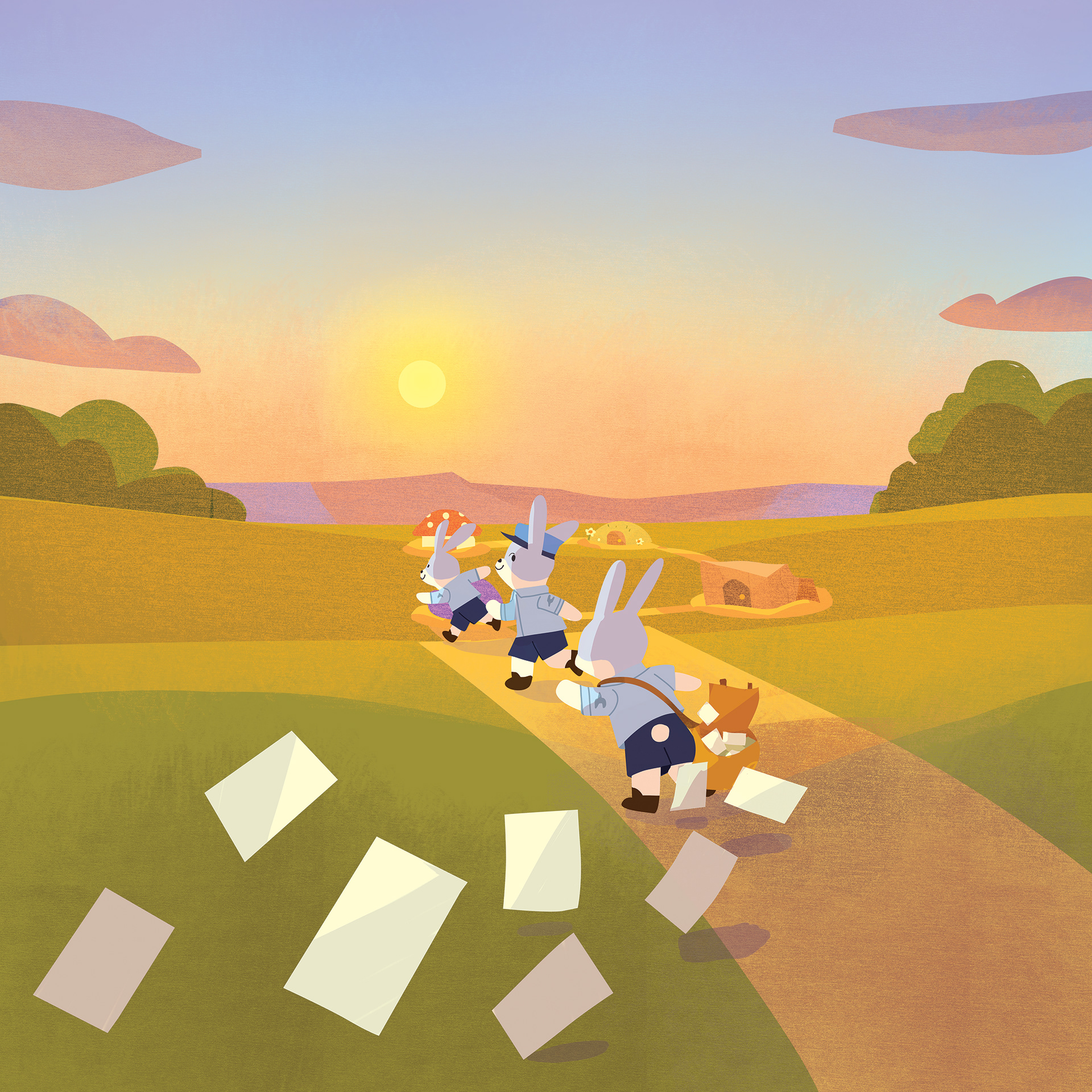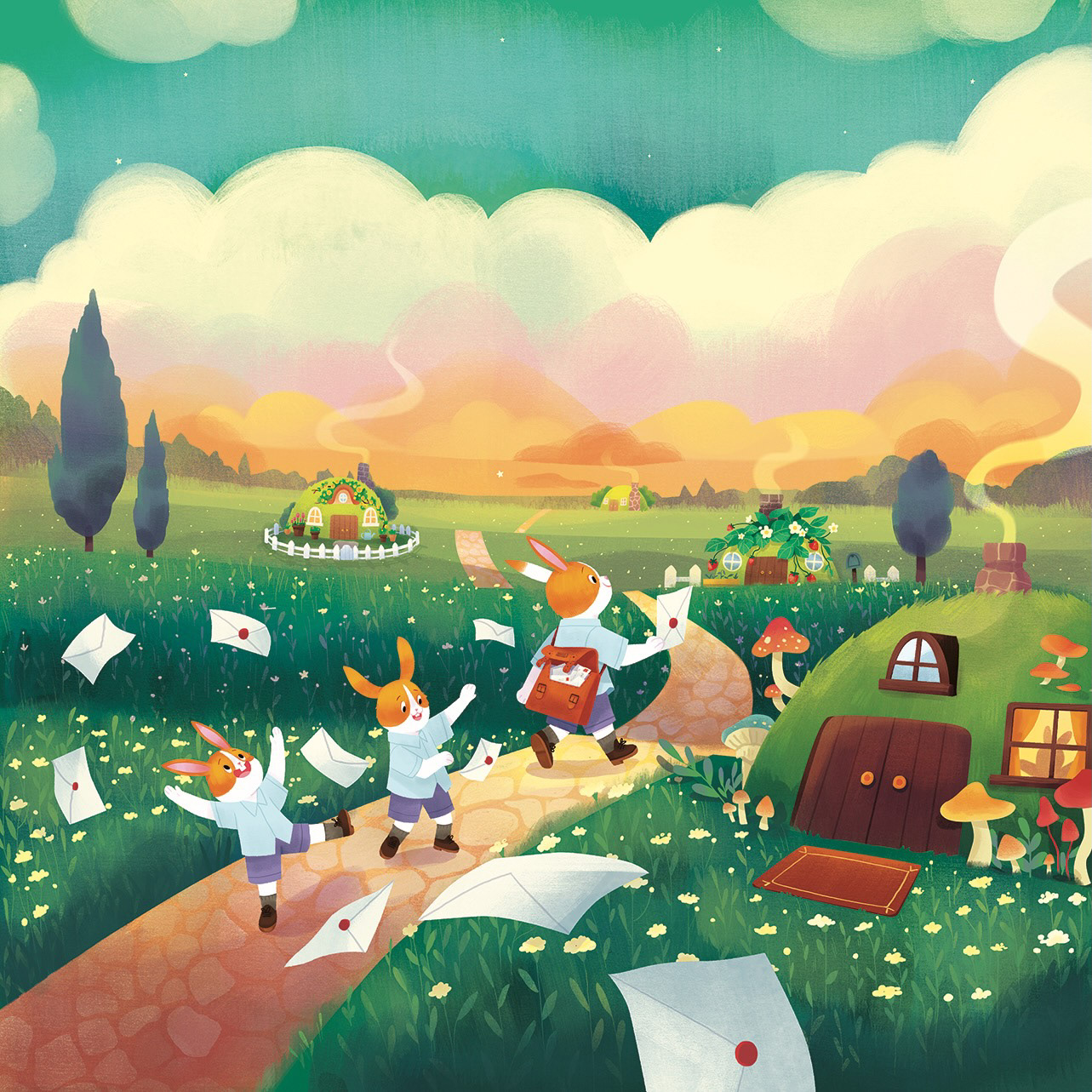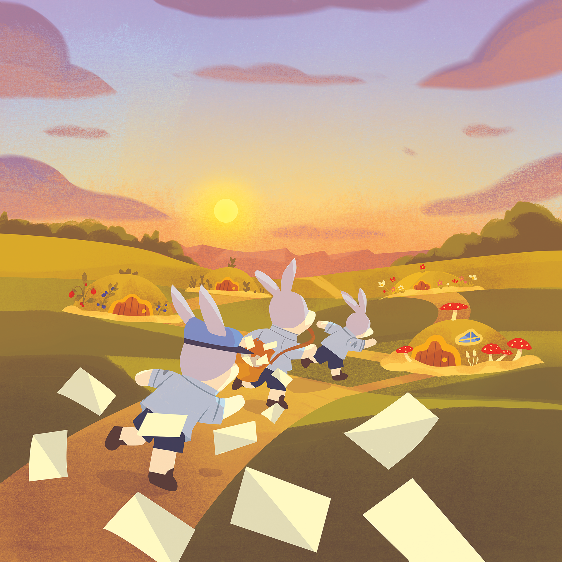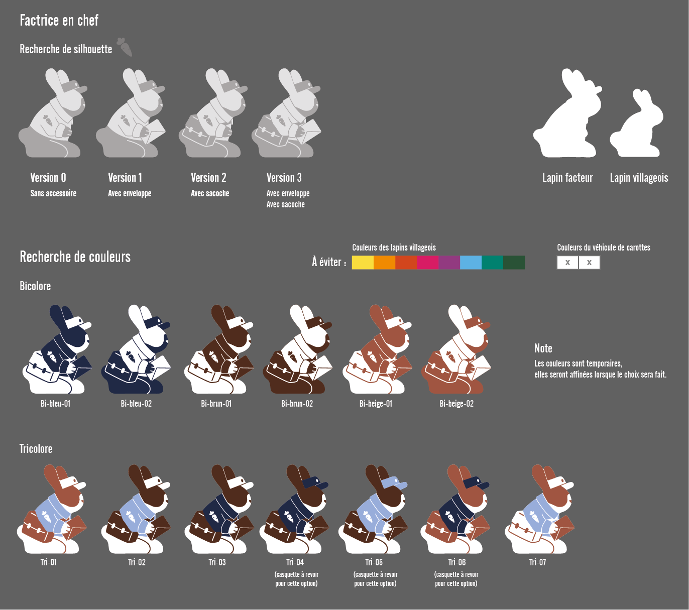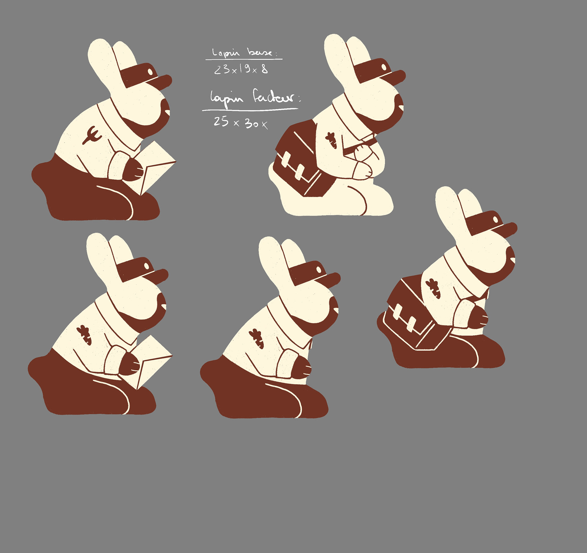 La Factrice en Chef garde la même silhouette que les lapins iconiques de l'Univers Dixit, mais pour la différencier, je l'ai faite plus grande et arbore un joli uniforme de factrice. Cet uniforme, présent également sur la couverture du jeu, devait parler à un maximum de personnes à travers le monde. C'était un travail passionnant à faire avec Emily, qui a illustré la couverture : une factrice française et une factrice coréenne n'ont pas du tout les mêmes équipements !
