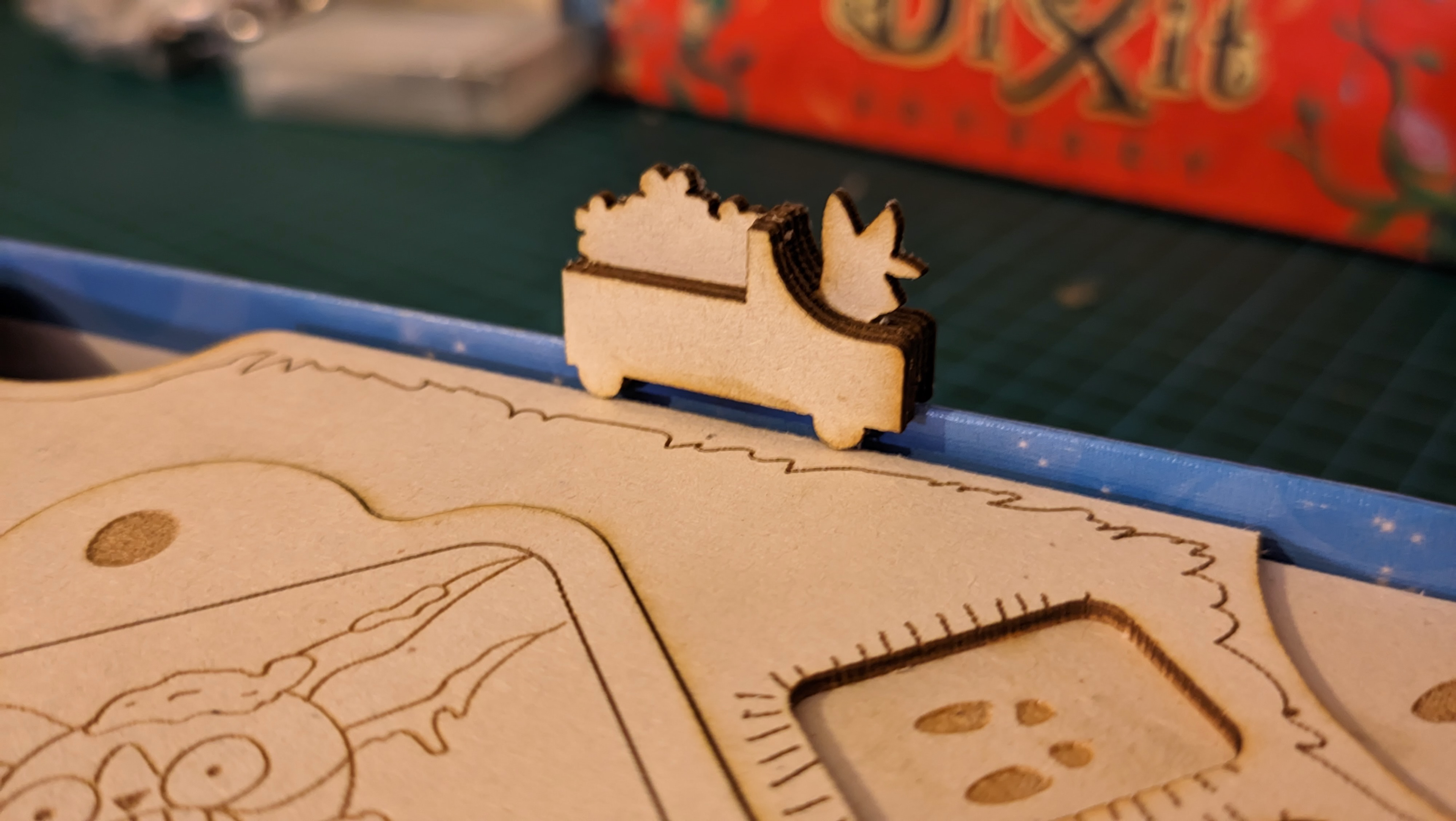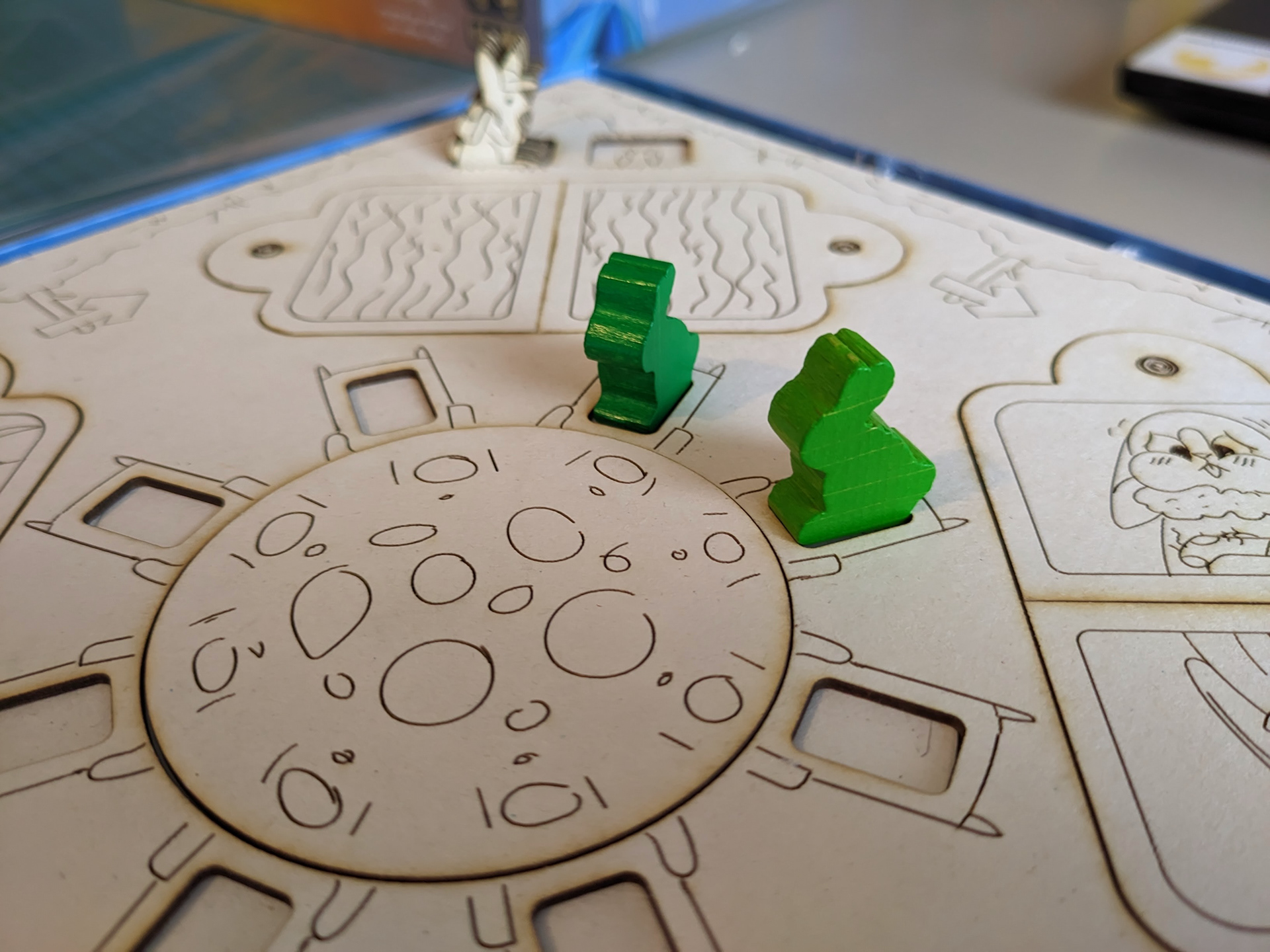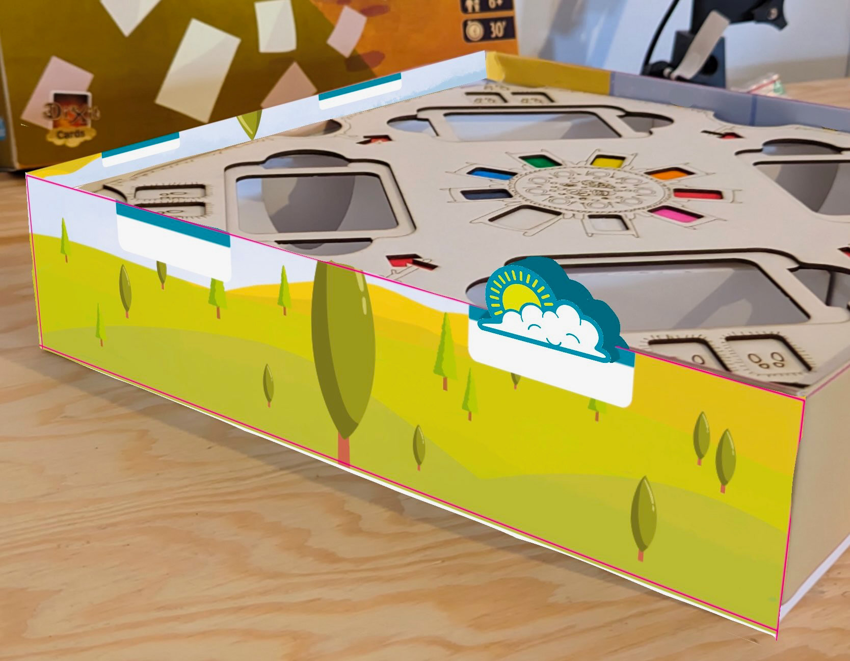 On joue directement dans la boîte, elle est l'élément central sur la table... mais ses bords n'étaient pas du tout exploités ! Ça a été un petit défi technique de créer une fente dans le meeple qui soit de la bonne largeur pour tenir droit sans être trop serrée. Un petit train, puis un tracteur, et finalement ce Soleil a vu le jour dans cette version finale !