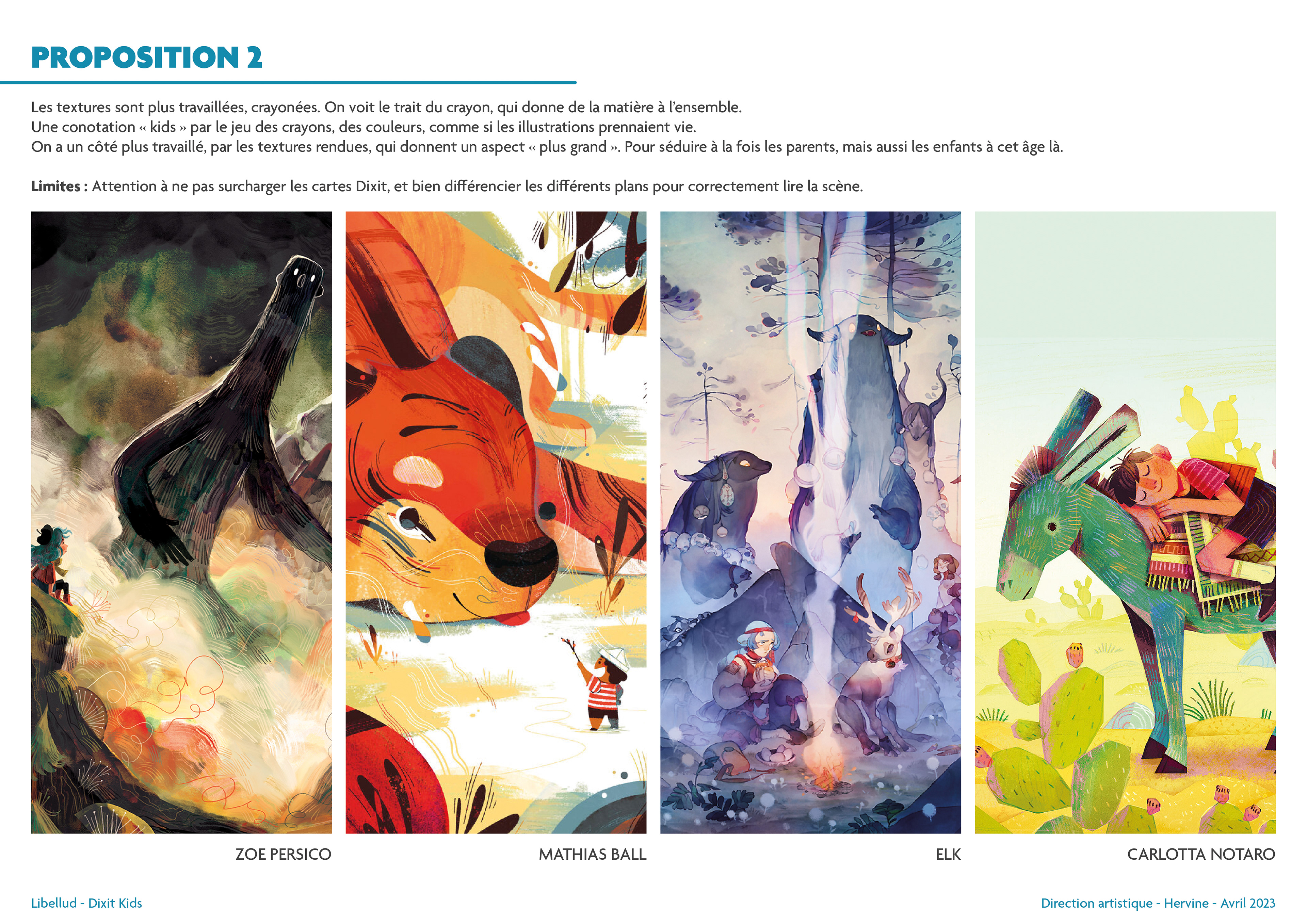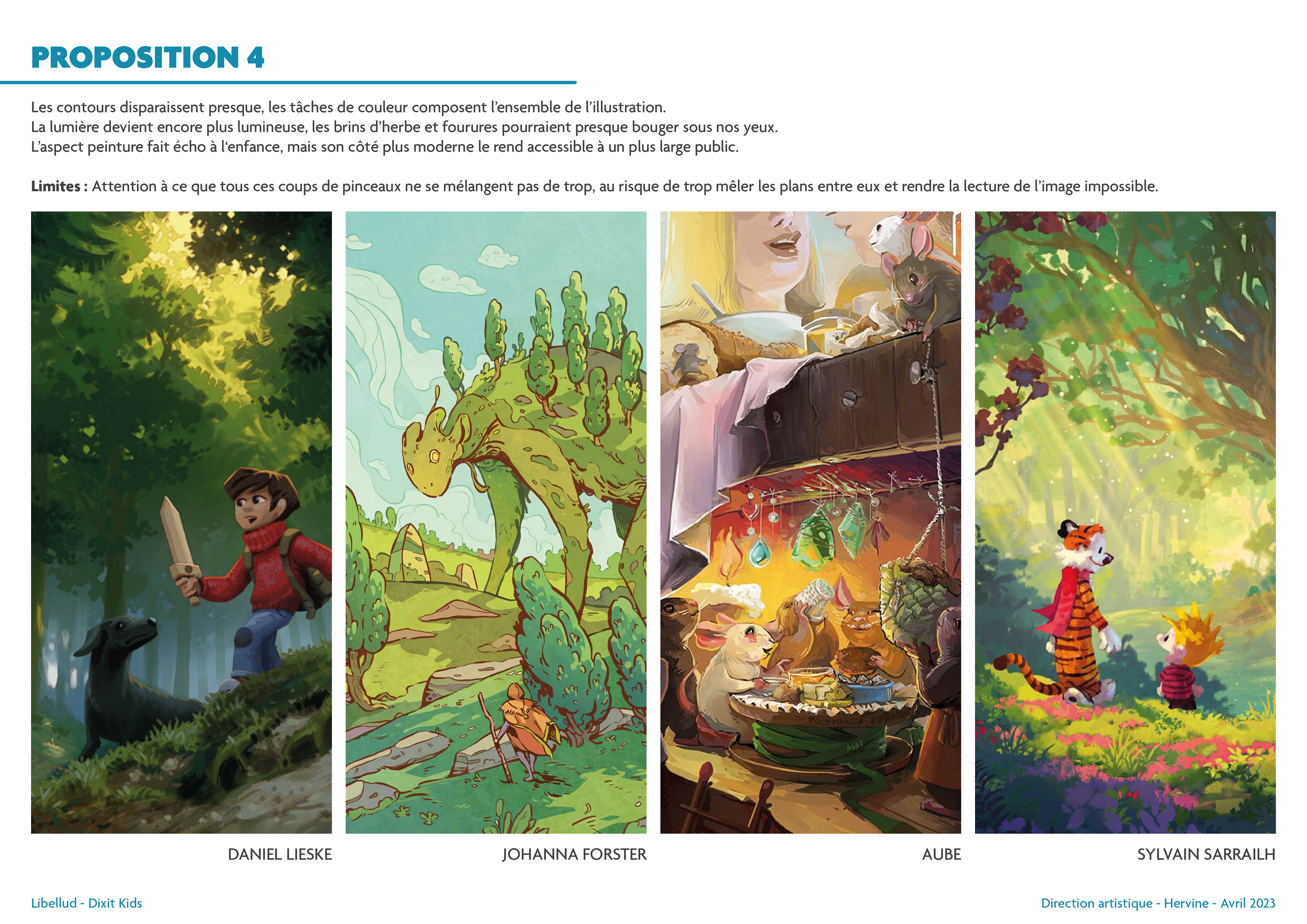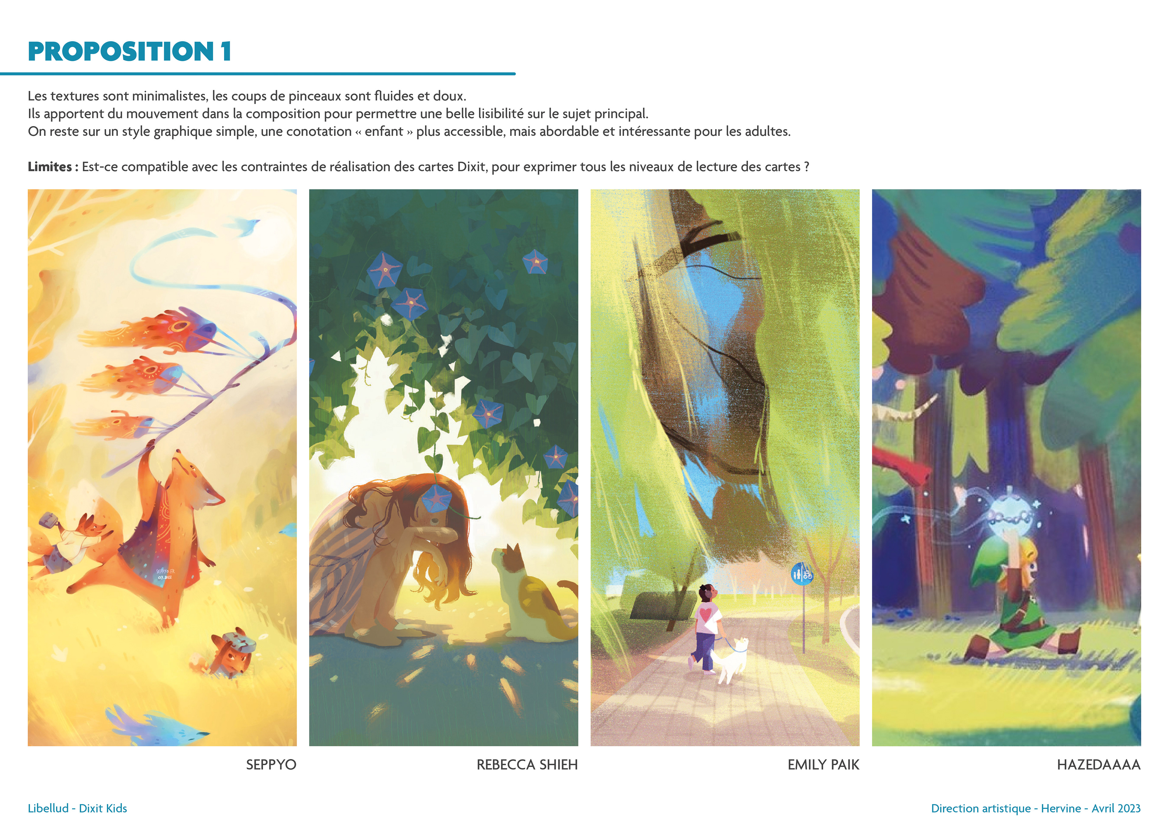 Une fois ces explorations terminées, j'ai proposé quatre univers graphiques, chacun accompagné de quatre artistes potentiels. C’est une amorce sur le choix des artistes, mais cela permet de se projeter immédiatement sur ce que pourrait donner la version finale de Dixit Kids. Vous remarquerez que deux des illustratrices de Dixit Kids étaient déjà présentes dans cette pré-sélection !