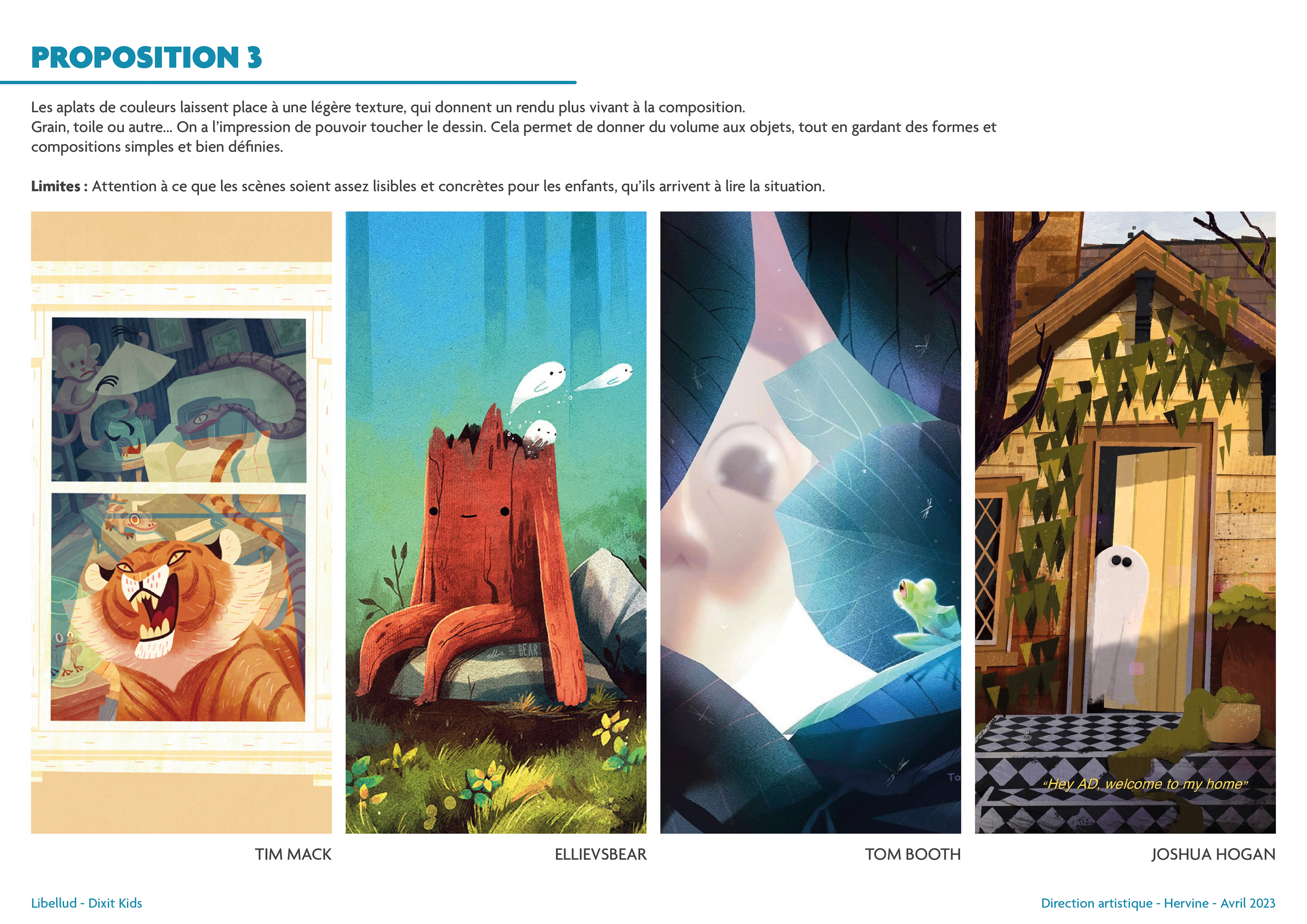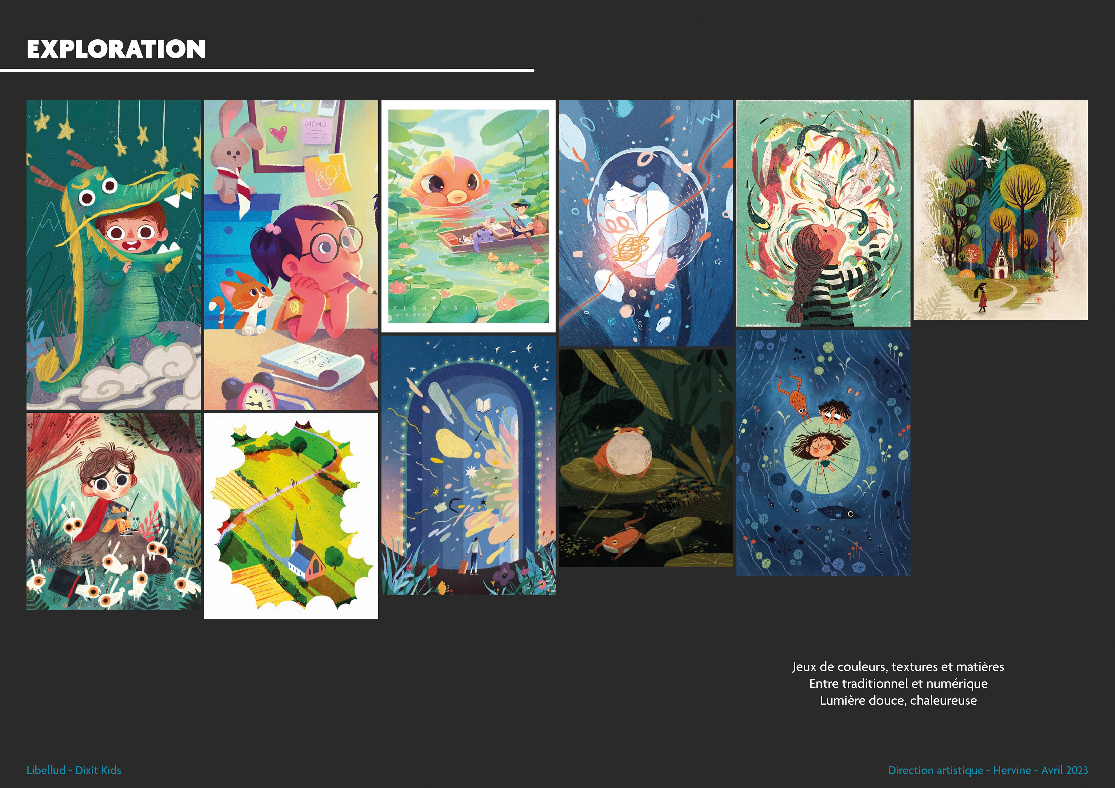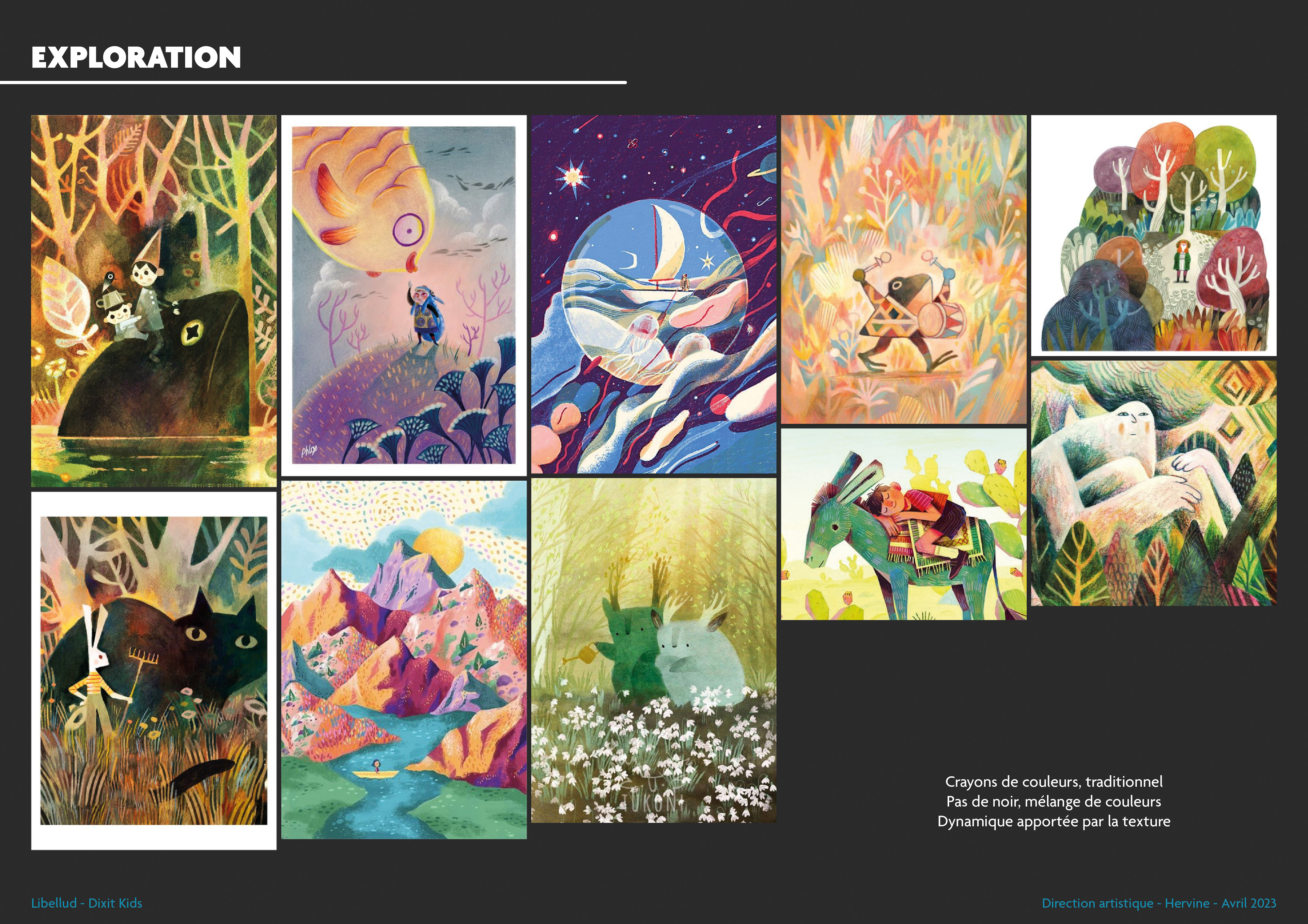 Une fois ces explorations terminées, j'ai proposé quatre univers graphiques, chacun accompagné de quatre artistes potentiels. C’est une amorce sur le choix des artistes, mais cela permet de se projeter immédiatement sur ce que pourrait donner la version finale de Dixit Kids. Vous remarquerez que deux des illustratrices de Dixit Kids étaient déjà présentes dans cette pré-sélection !