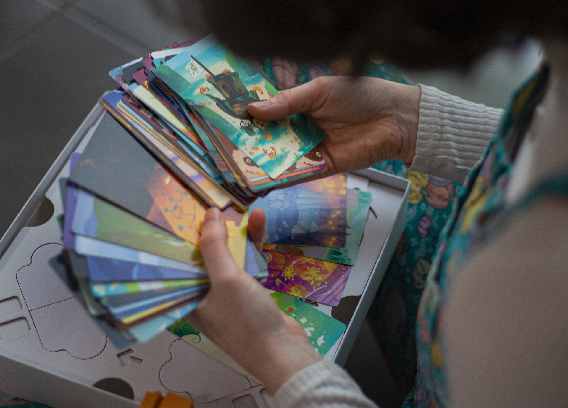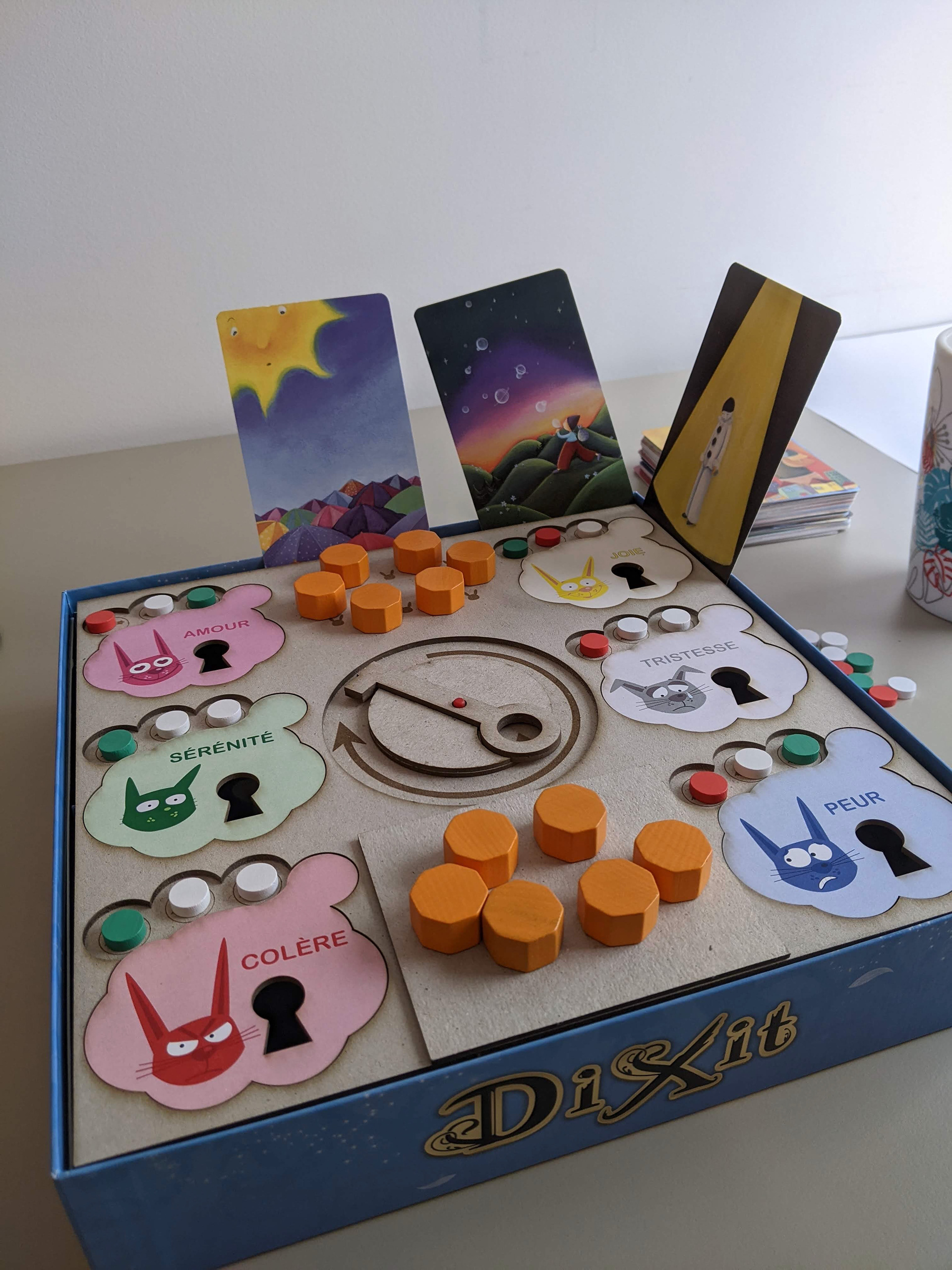 Une fois les illustratrices choisies, il fallait leur faire travailler sur 21 cartes chacune… en même temps. Je ne peux pas vous révéler en détail les coulisses du travail sur les cartes, mais je peux vous dire que le travail était plus long qu'il n'y paraît. Contrairement à un Dixit classique, qui aborde des sujets très divers et variés, les cartes de Dixit Kids doivent contenir les 32 notions… avec un équilibrage fin pour que le jeu reste jouable à chaque tour ! Un vrai travail d'orfèvre… qui m'a conduit à constituer et à diriger une grande équipe chargée de vérifier tous les aspects des cartes.