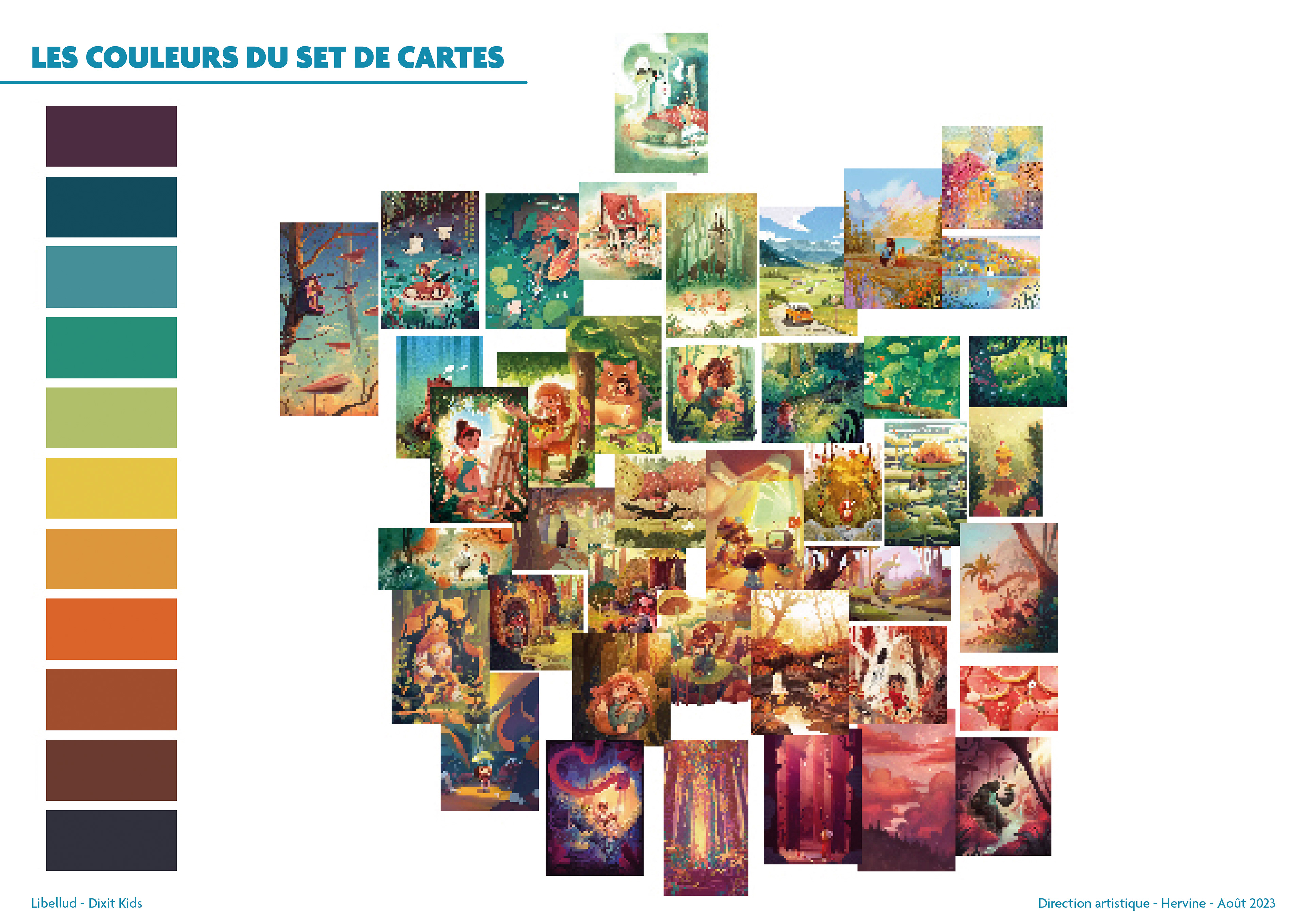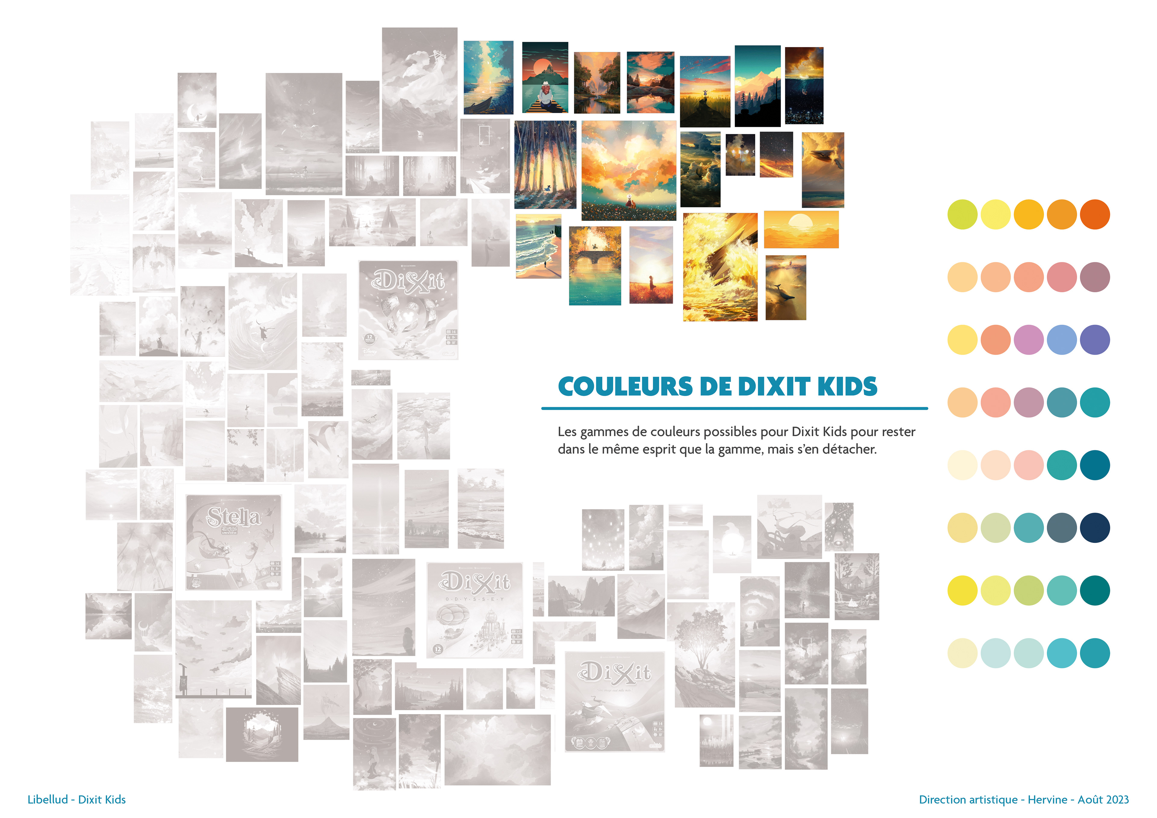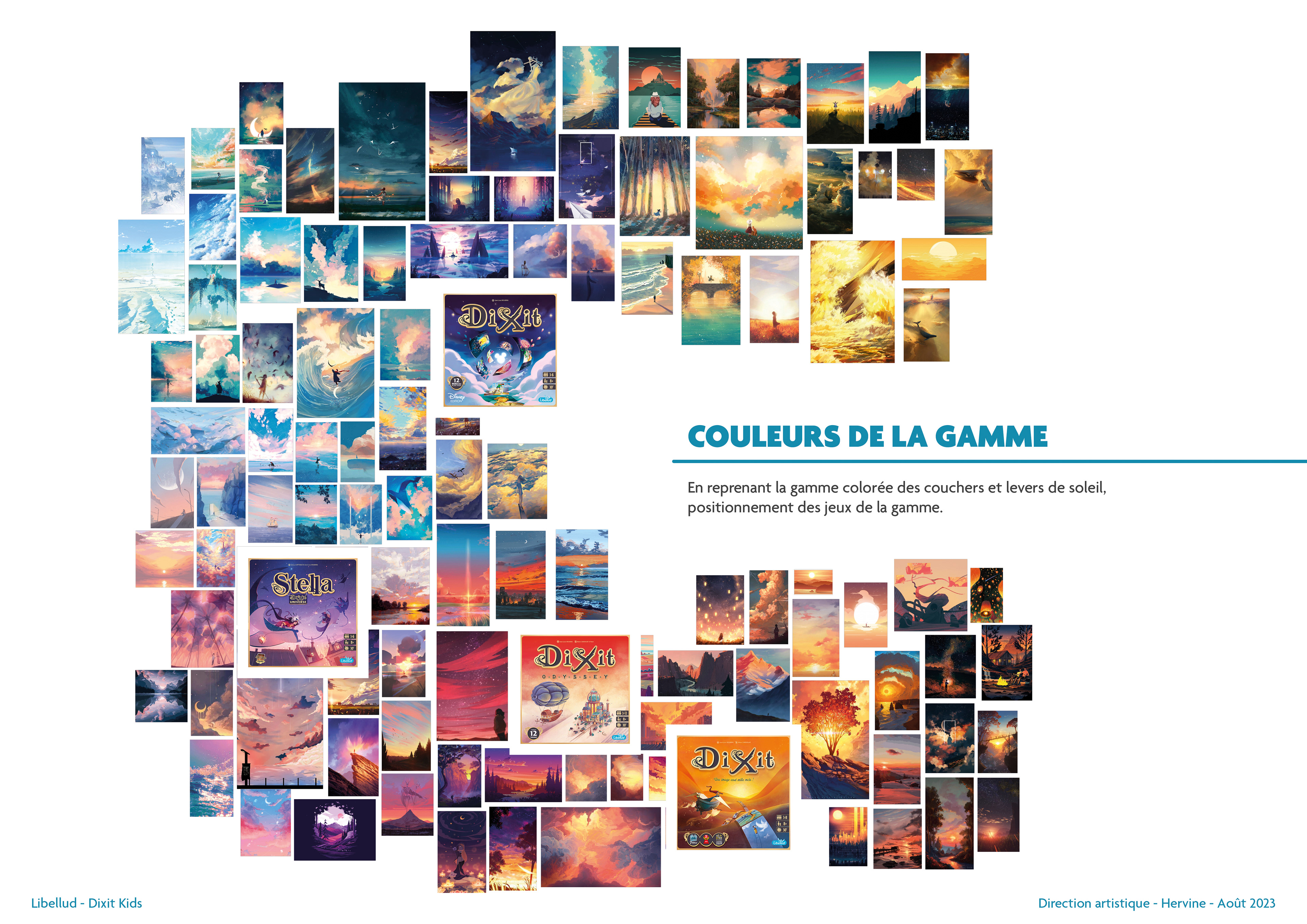 L'un des aspects forts de l'Univers Dixit est la présence d'un astre dans un ciel. Cependant, le ciel peut prendre plusieurs teintes et ambiances différentes, ce qui se ressent particulièrement dans les jeux déjà édités de Dixit. Pour mieux visualiser le panel de possibilités, j'ai composé un dégradé de ciels et positionné la gamme Dixit dans ce spectre. La place de Dixit Kids s'est trouvée naturellement dans les tons verts et jaunes !