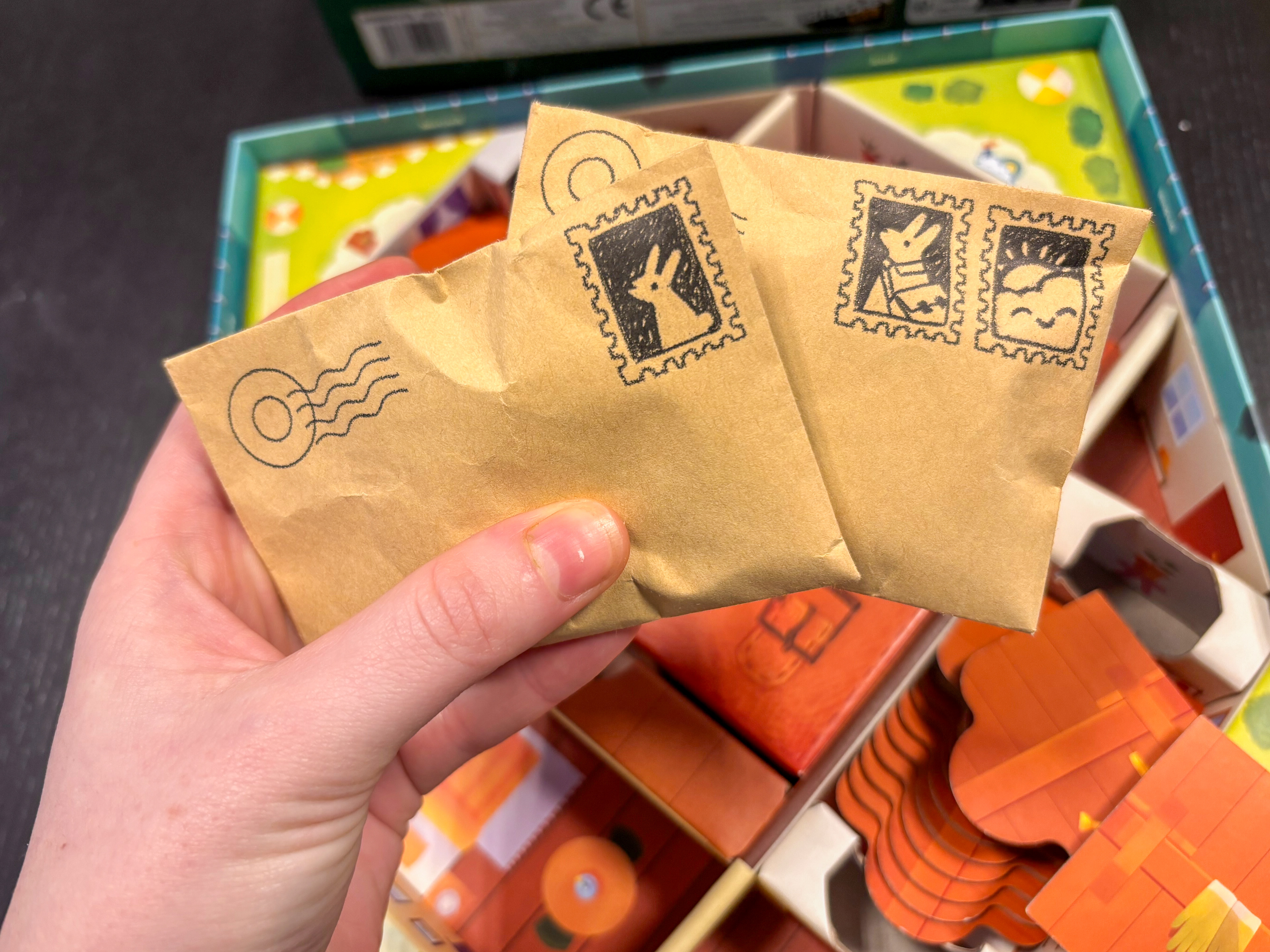 Pour ranger les meeples et éviter qu'ils ne s'abîment pendant le transport, il était évident d'ajouter des petits sachets. Plutôt que de prendre des sachets en plastique. Et pour rester dans le thème du jeu, je les ai transformées en petites enveloppes postales ! J'ai illustré les timbres pour les décorer joliment, mais ils font aussi un clin d'œil à ce que vous pouvez y ranger à l'intérieur !